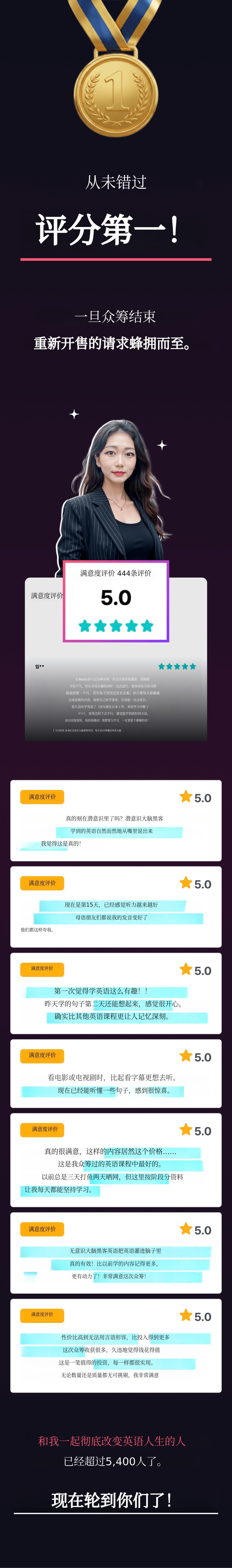 现在我想把这项创新的“无意识英语学习法”介绍给更广阔的世界。 本次众筹项目不仅仅是单纯销售教育内容。通过我的热情和学员们的成功故事,为更多人带来英语学习的新希望和可能性的项目。