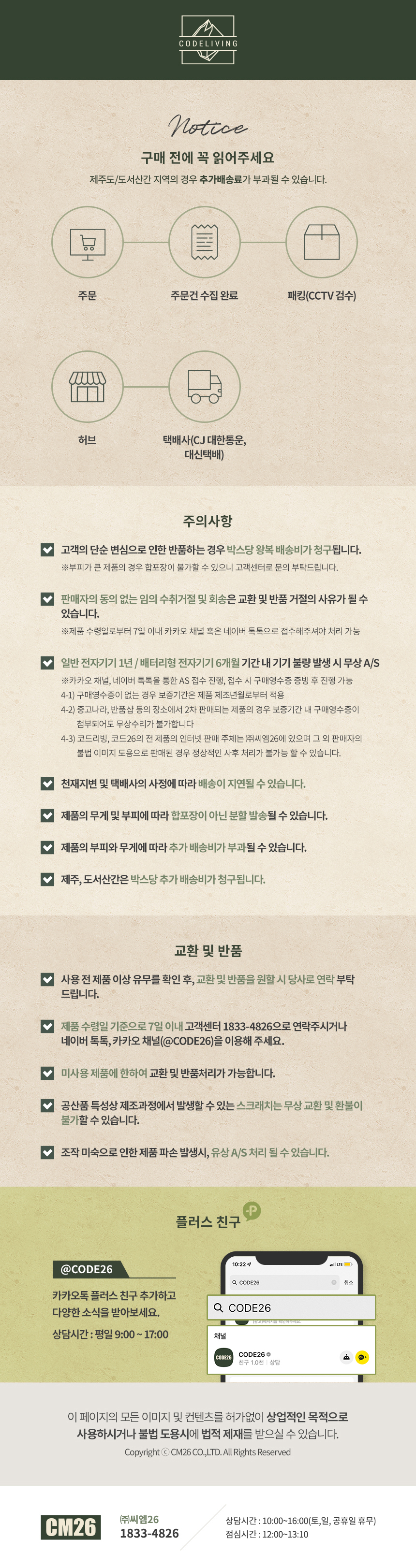 (주)씨엠26 브랜드는 체계적인 시장 분석과 고객 니즈 분석을 통해 코드26/코드리빙 만의 감성으로 재해석 된 상품들을 출시하고 있습니다. 나의 삶의 가치를 격상시킬 수 있는 다채로운 제품들을 현재 입점 되어 있는 30개의 플랫폼 외 와디즈 플랫폼을 통해서도 선보이고자 합니다.