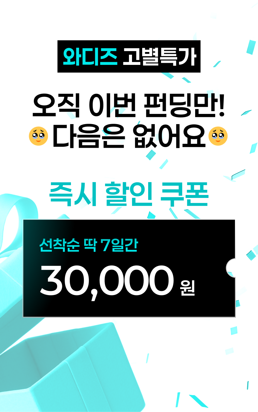 저희는 와디즈에서 저희 브랜드의 여정을 시작했어요. 와디즈 서포터님들 덕분에 2번의 펀딩으로 2억을 달성했죠. 성공적인 펀딩과 자금을 발판으로, 올리브영을 비롯한 다양한 채널에 진입할 수 있었답니다. 다시금 저희의 시작을 응원해주신 와디즈 서포터님들께 감사의 말씀을 드려요!