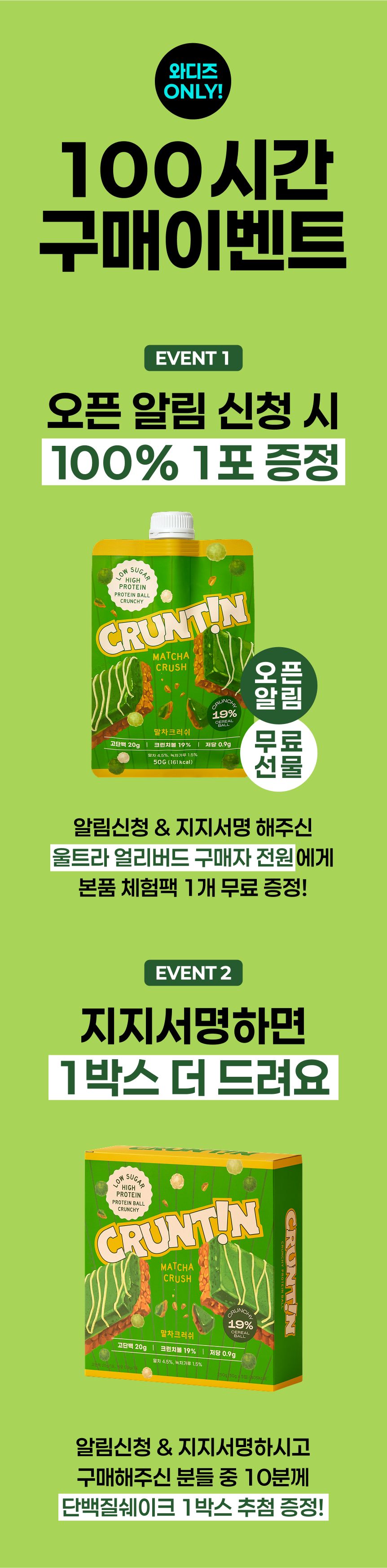 예전에 많은 와디즈 서포터님들께서 2번째 맛도 와디즈에서 출시할거냐 물어보셨을 때, 저희가 꼭 그러겠다고 약속했답니다. 그리고 이번 펀딩은, 저희를 믿고 서포트해주신 서포터님들을 위한 감사의 표현이에요. 세상에 없던 말차맛 단백질쉐이크를 찾으시는 서포터님들을 위해 준비했습니다. 세상에서 가장 먼저 와디즈 서포터님들께 맛보여드리고 싶어요.