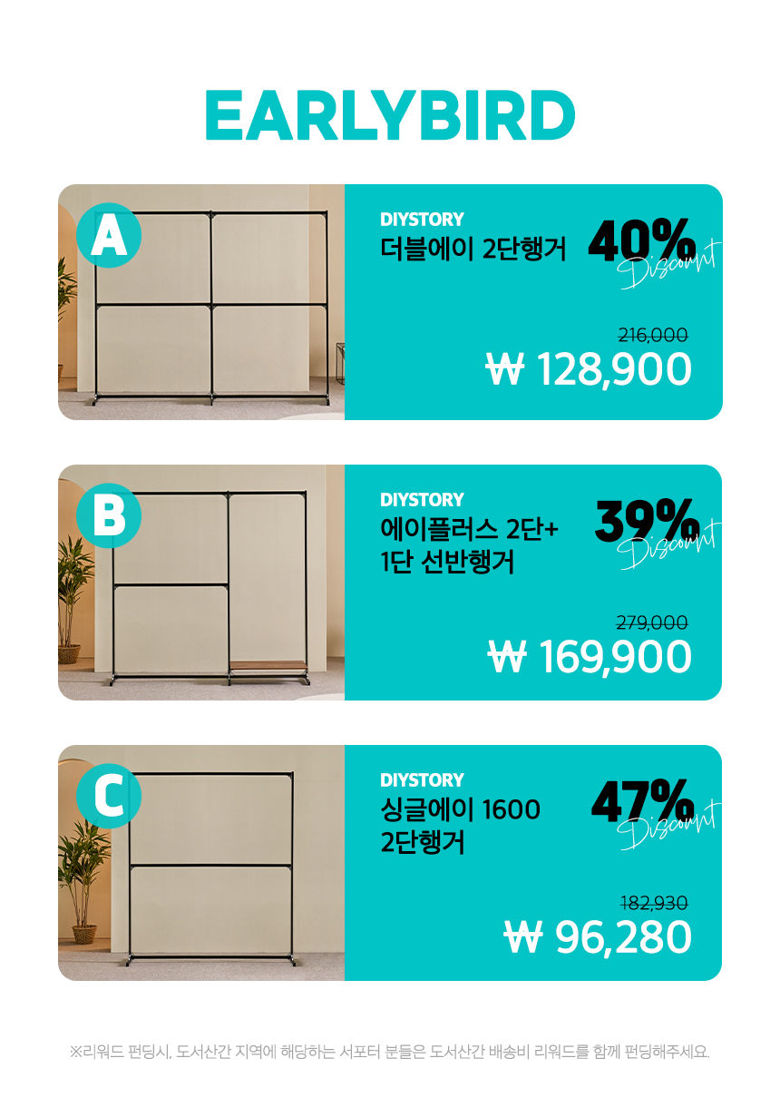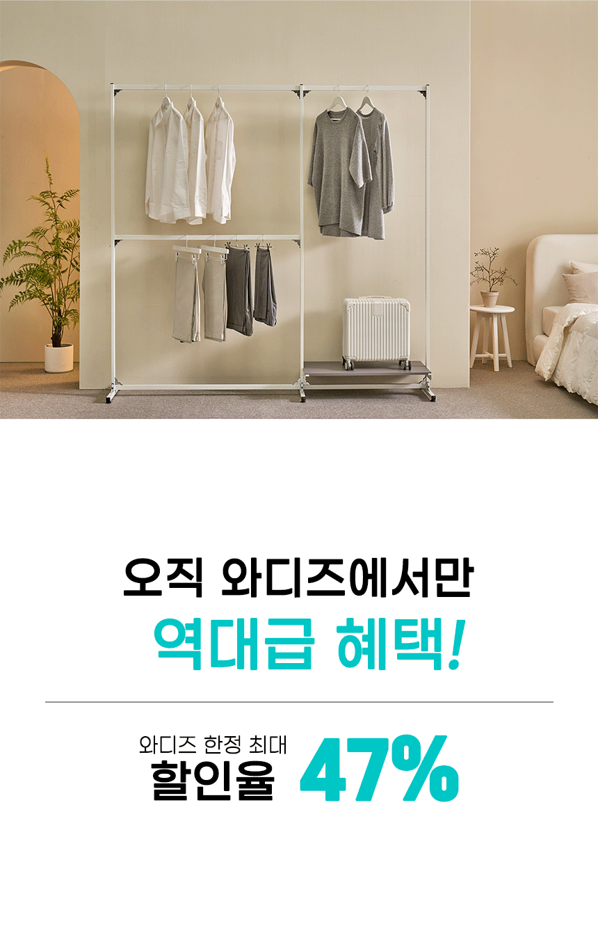 1. 🛠️ 专利组装钢制衣架 - 采用坚固国产钢材和专利支架 2. 🏠 实用室内收纳方案 - 简易组装拆卸,灵活利用空间 3. 🎁 Wadiz独家47%折扣 - 限量超级早鸟及早鸟优惠