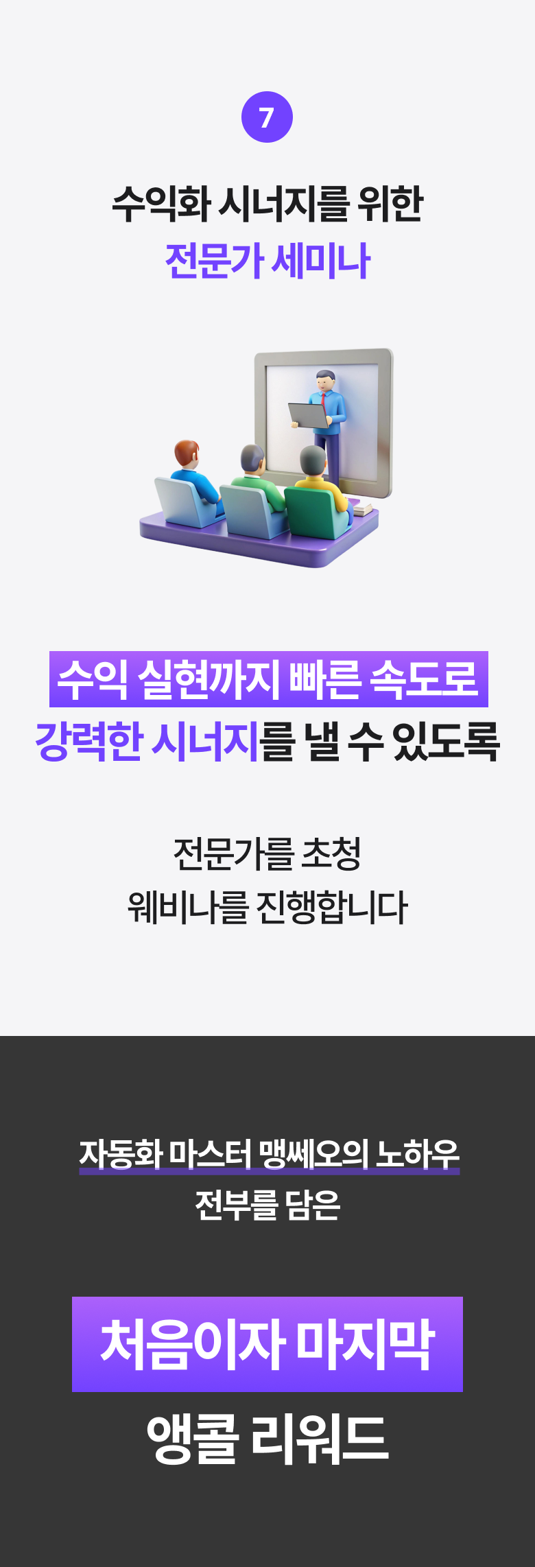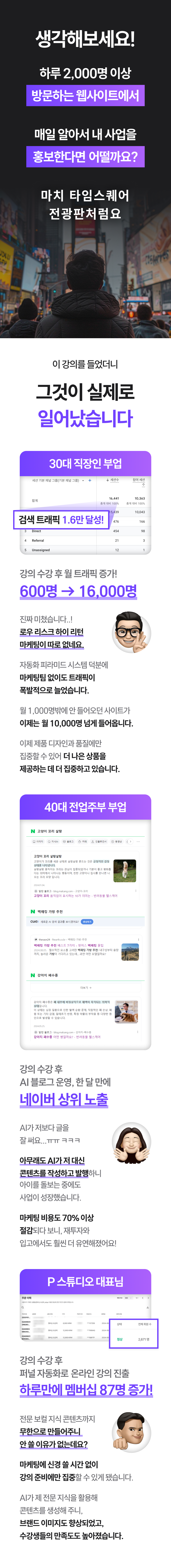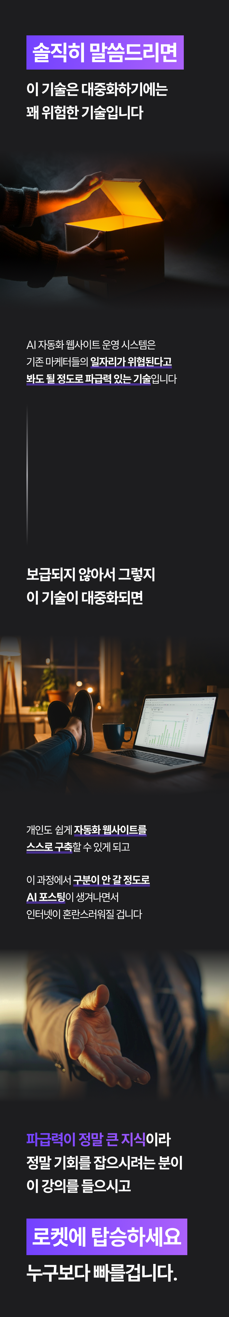 이 글을 여기까지 읽으셨다면, 똑똑하실수록 이 기술의 가치와 필요성을 더욱 더 잘 이해하실거라고 생각합니다. 현재까지 세상에 존재하지 않았던 기술이니까요. 저는 이 기술의 가치를 가장 잘 이해하시는 분께, 아낌 없이 제가 가진 모든 지식을 드리고 싶습니다. 새로운 시대의 기술의 수혜자가 이 글을 읽는 대표님이었으면 좋겠습니다. 그러면 강의에서 뵙겠습니다! 감사합니다.