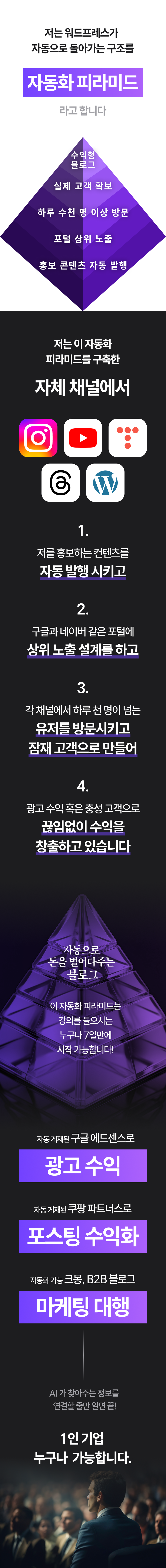 또한 인스타그램, 네이버 블로그, 쓰레드 등 다양한 SNS 채널과 연동하여 자동으로 콘텐츠를 발행하는 방법을 익힙니다. 코딩 지식 없이도 전문적인 웹사이트 운영과 마케팅 채널 관리가 가능합니다.