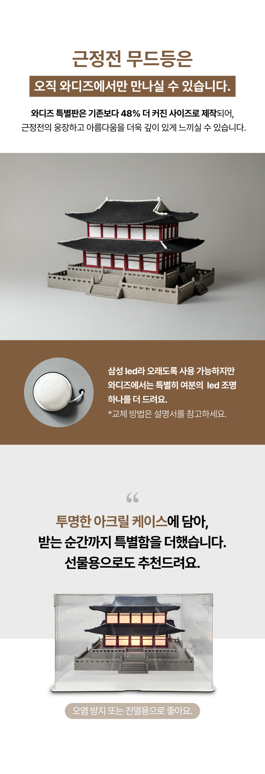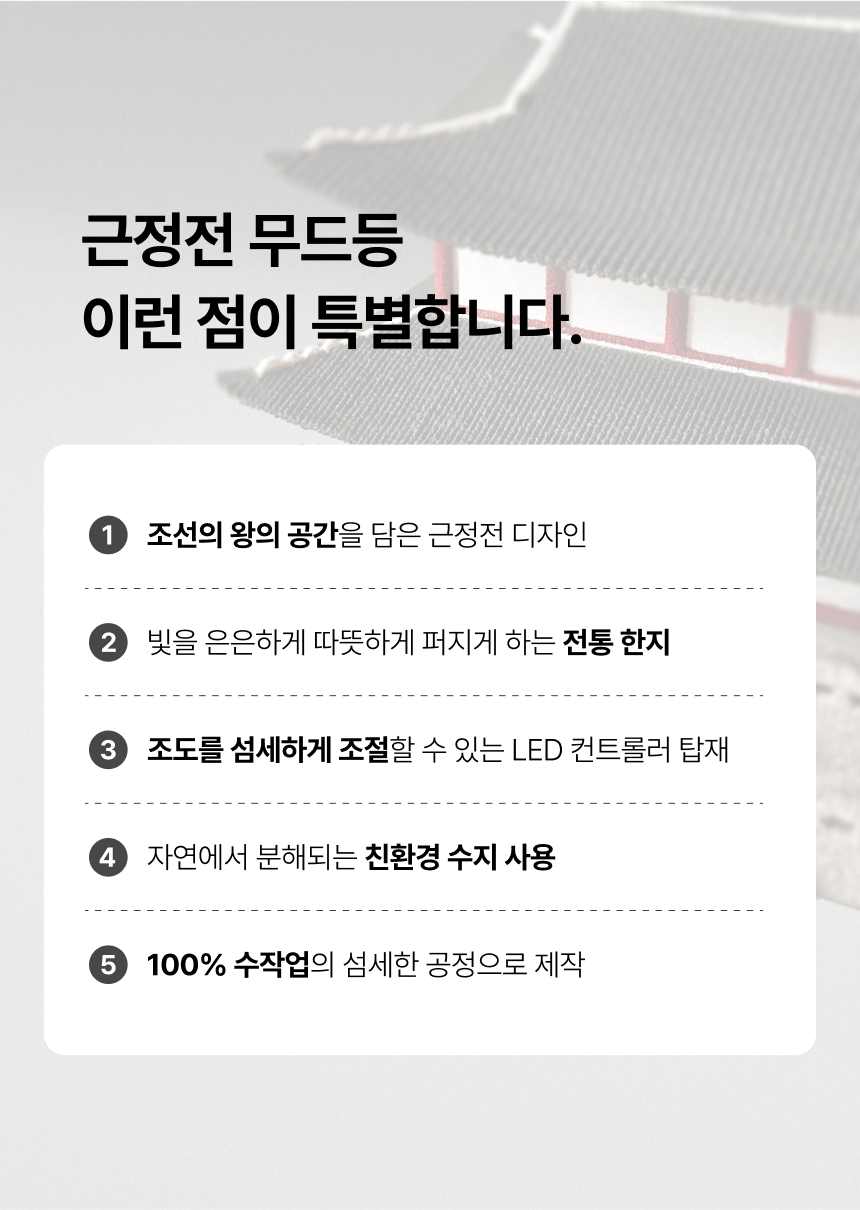 1. 🏯 勤政殿氛围灯 - 再现朝鲜勤政殿设计,传统与现代融合 2. 💡 沉思之光 - 提供舒缓光线,整理一天准备明天 3. 🎁 独家限量福利 - 尺寸增大48%,附赠三星LED