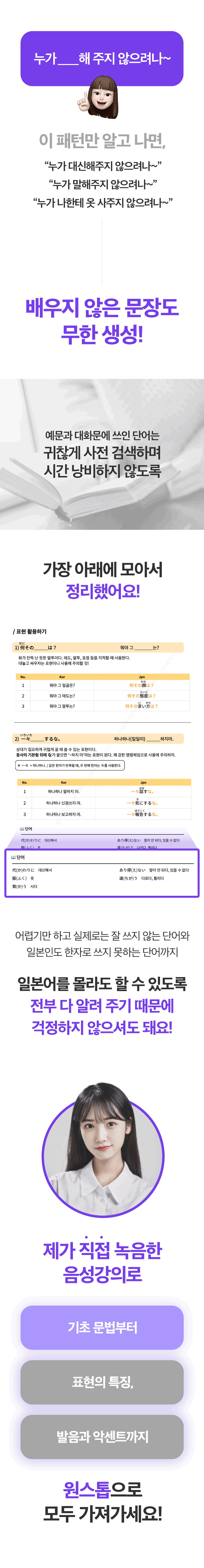한국인인 줄 모를 정도로 자연스러운 일본어 구사력은 물론, 정확한 발음, 악센트까지 모조리 알려 드립니다.
