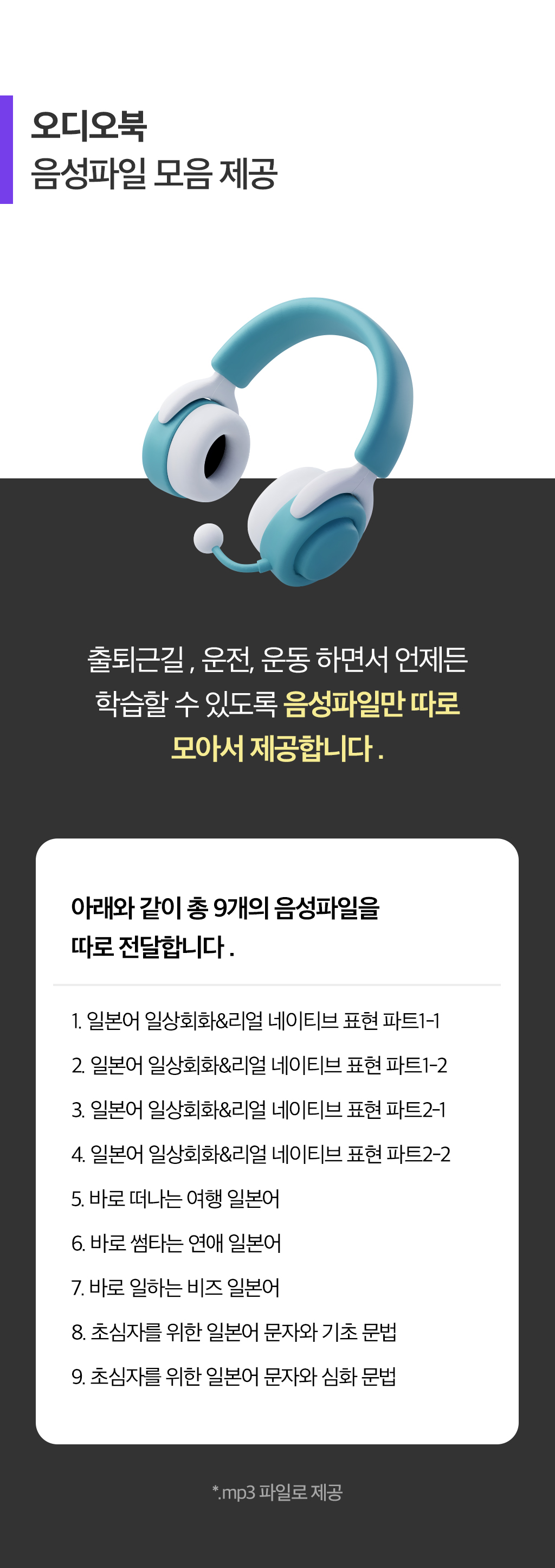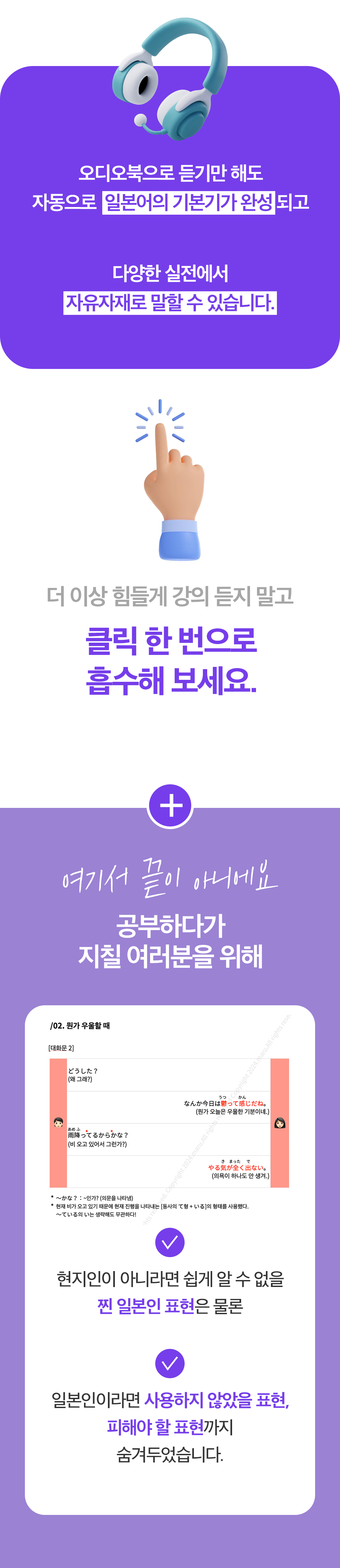 기본적인 인사부터 연인과의 싸움, 혼잣말까지! 수십 가지의 상황을 리얼한 회화문과 예문을 통해 학습할 수 있어요. 만약 아직 글자 암기나 기초 문법이 잡히지 않은 분들이 계시다면, 오디오북C, D(왕초보자를 위한 일본어 기초 문법)를 통해 기초 문법부터 중급 문법까지 예습, 복습을 할 수 있어요. ‘나아직 문법 잘 모르는데…’하는 걱정은 넣어두셔도 좋아요!
