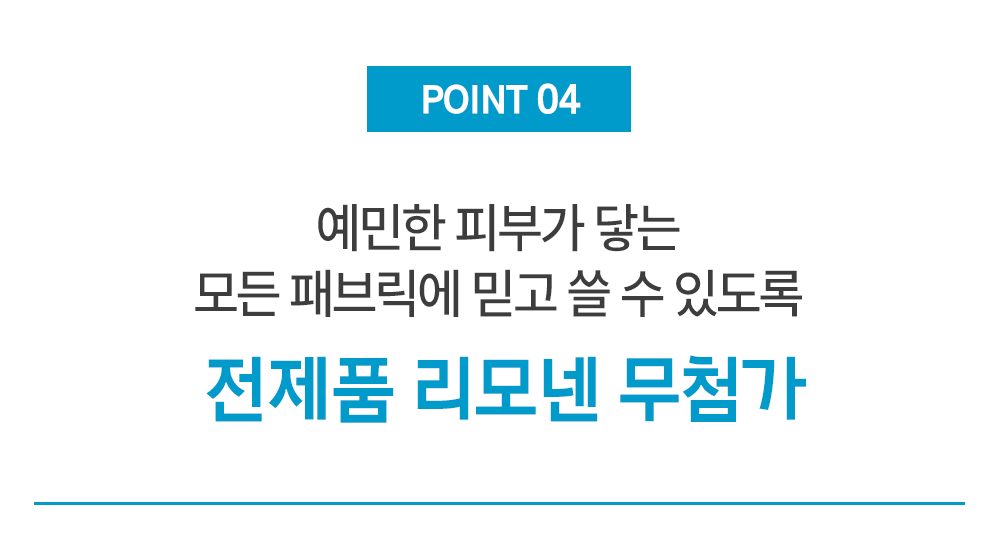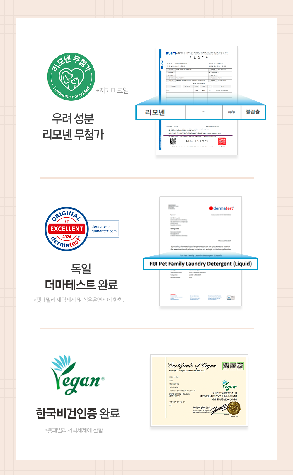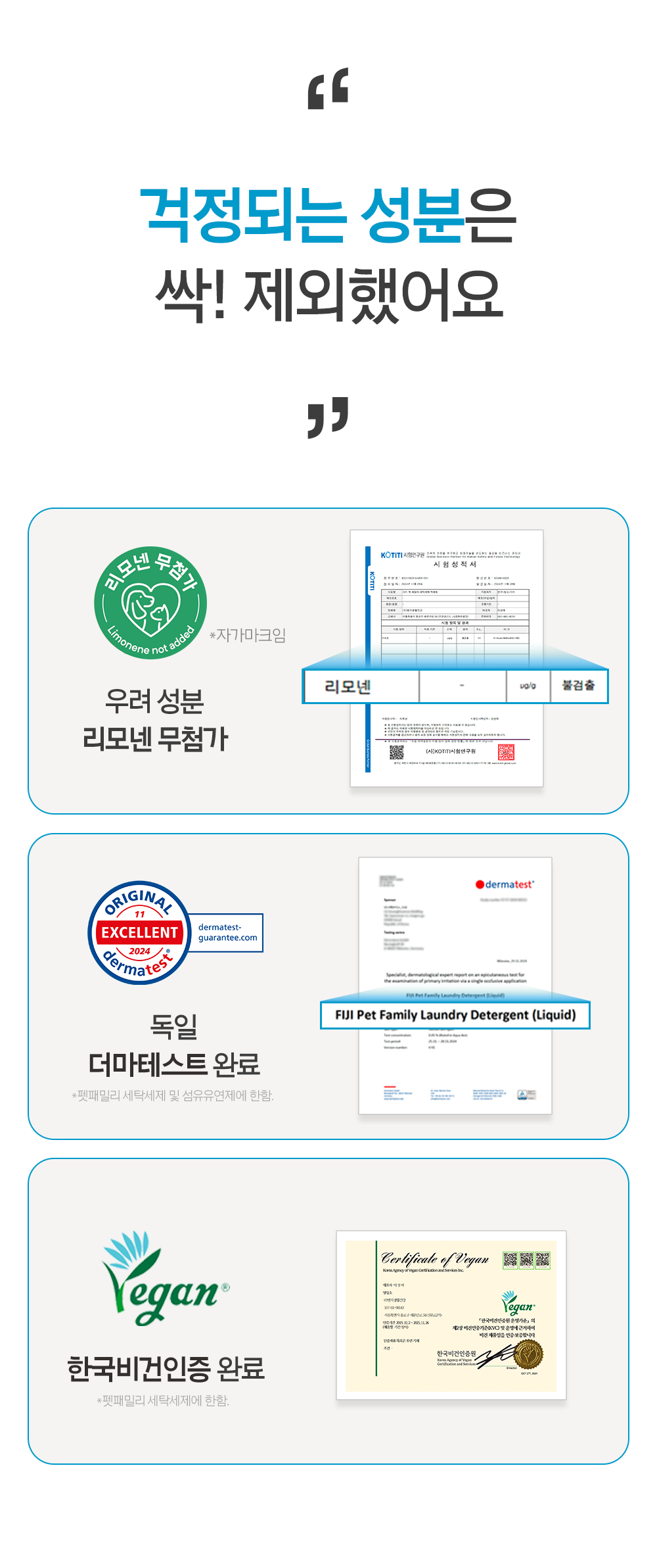 시중에 많은 세정력을 강조한 세탁세제에서 리모넨 사용이 빈번하게 나타나고 있는데요. 펫패밀리 세탁 세제 및 섬유유연제에는 우려 성분인 리모넨을 넣지 않아 믿고 쓰실 수 있습니다.