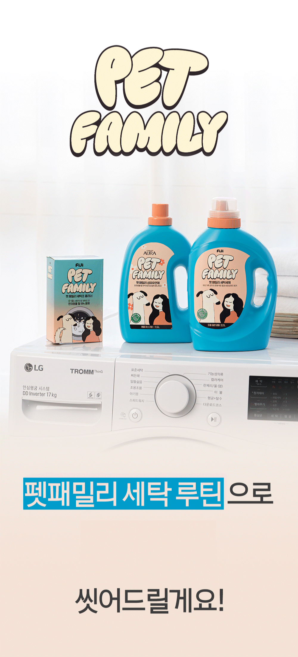 반려동물 전용 제품은 있어도 반려인과 반려가족 모두를 위한 브랜드, 들어본 적 있으신가요? 세상에 없던 브랜드의 첫 라인업을 함께 서포터님들께 보여드리고 싶었습니다. 세탁 라인업은 세탁세제-섬유유연제-세탁조클리너까지 함께 써야 그 진가를 알 수 있는 제품들이기에 특별히 종합 선물 세트로 들고 왔어요. 반려 가족이시라면 다른 세제와 유연제 들일 필요없이 내가 어제 입은 옷부터 반려동물 애착인형까지, 집에 있는 모든 패브릭들을 펫패밀리 하나로 끝낼 수 있는 신세계가 펼쳐질 거예요.