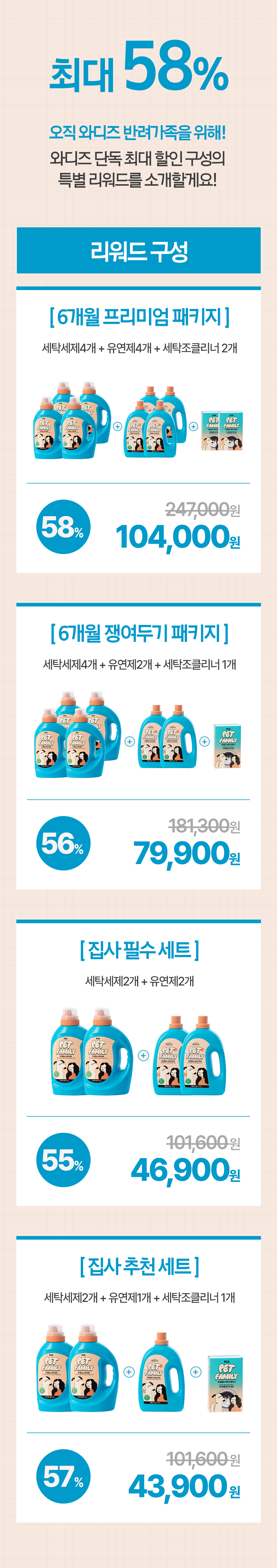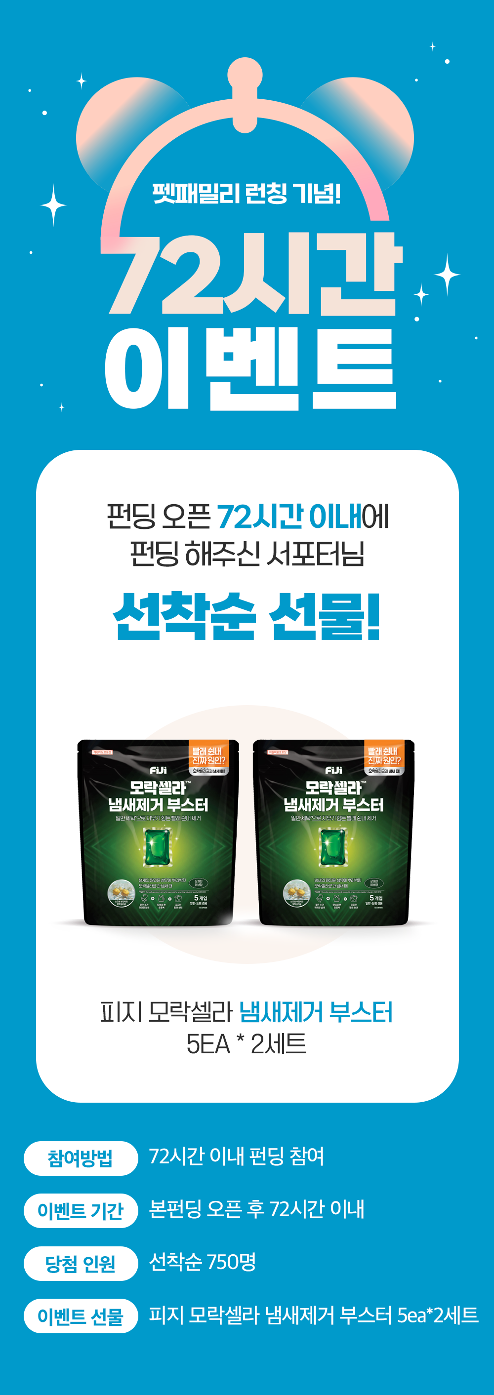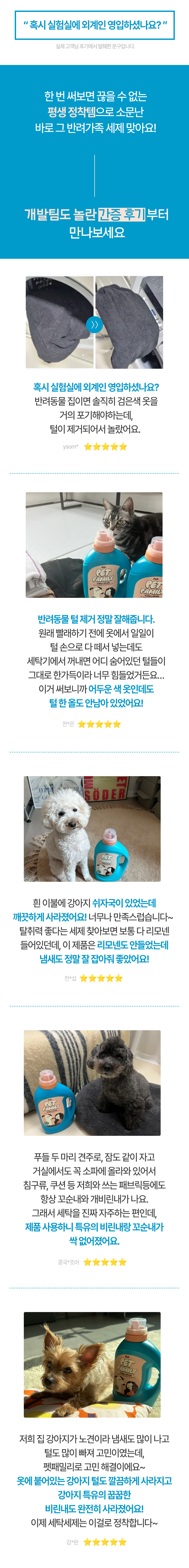 60만 회원의 반려인 커뮤니티에서 각종 이야기를 주의 깊게 들었고, 일상생활에서 반려동물을 사랑하는 것과는 별개로 냄새와 털로 인한 불편함이 존재한다는 것을 발견했습니다. 펫패밀리는 냄새와 털 고민을 해결할 수 있는 방법으로 세탁 라인업을 생각했고, 50년 넘게 세제를 연구해온 LG생활건강 연구소와 함께 이런 불편함을 근본적으로 해결할 수 있는 방법을 찾았습니다. 이런 펫패밀리 세탁 라인업의 종합세트를 와디즈에서 처음 선보일 수 있게 되어 기쁩니다. 반려인들이 느끼는 일상 속의 작은 불편함을 해결해주고, 반려동물에게 걱정되는 성분들까지 깐깐하게 확인하여 믿을 수 있는 반려가족 모두를 위한 브랜드. 펫패밀리가 앞으로 만들어 나가고자 하는 브랜드 입니다.