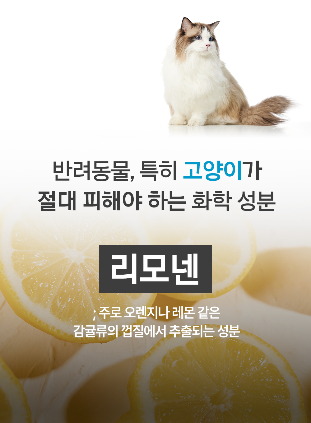 고양이들은 대부분의 리모넨을 구성하는 오일을 대사할 효소들이 없으며 이에 따라 몸속에 오일 성분들이 축적되면 질병으로 이어질 수 있는데요. 그렇기에 리모넨은 반려동물이 피해야 할 대표적인 화학 성분입니다.
