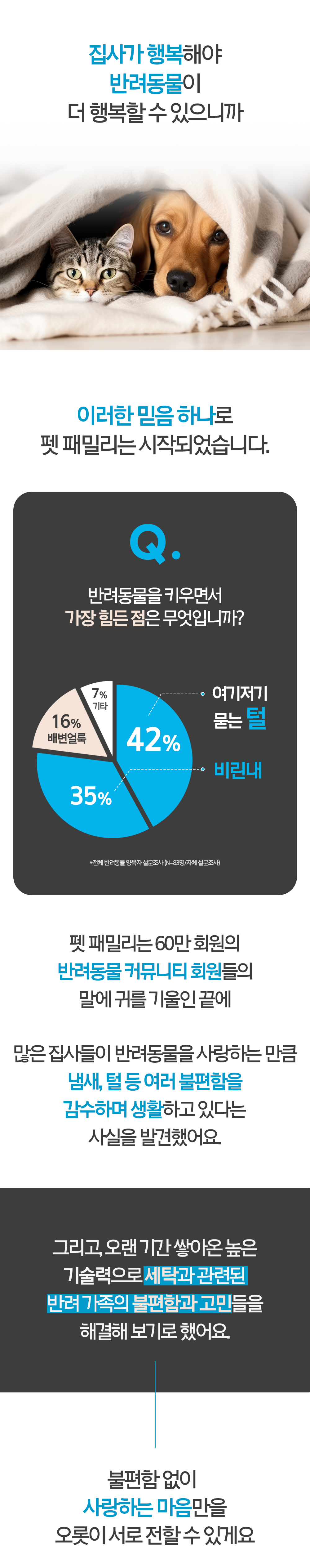 반려동물을 키우기 시작한 그 순간부터 우리는 어떤 것이든 함께하는 가족이 되죠. 저희는 행복한 반려생활을 위해서는 반려인이 우선 행복하고 편안해야 한다고 생각했습니다.