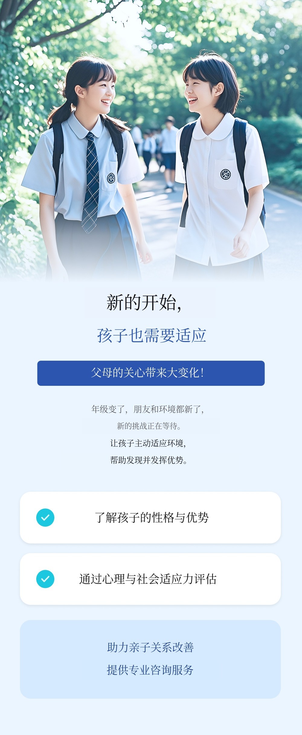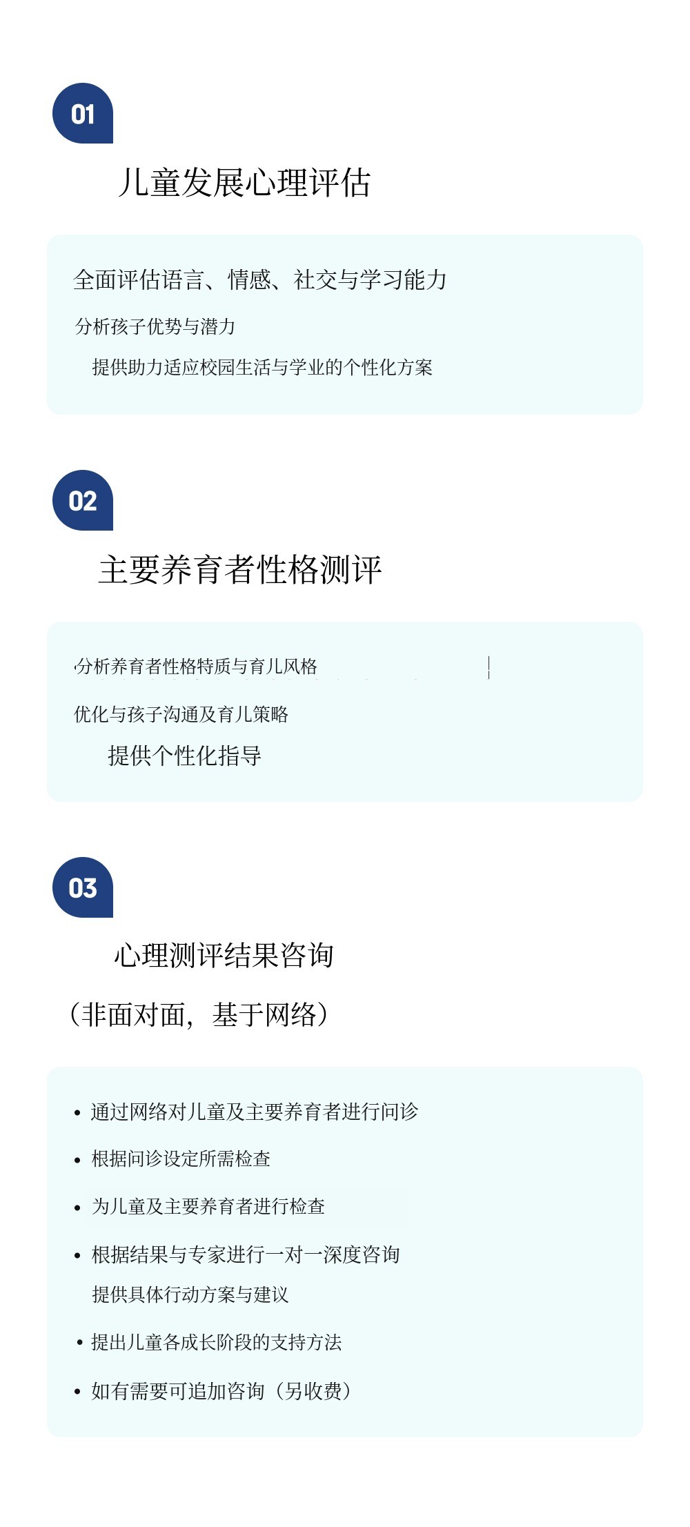 科学诊断孩子的性格和优势、心理及社会适应力,并通过专业咨询帮助改善亲子关系与沟通。