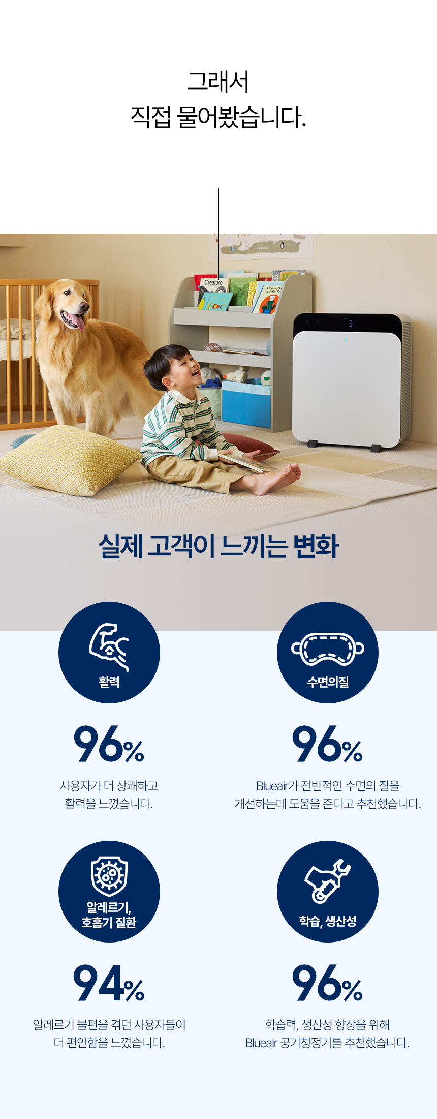 이제 블루에어의 뛰어난 기술력과 우리의 서비스 경험을 바탕으로 더 깨끗한 공기를 위한 솔루션을 제공합니다.