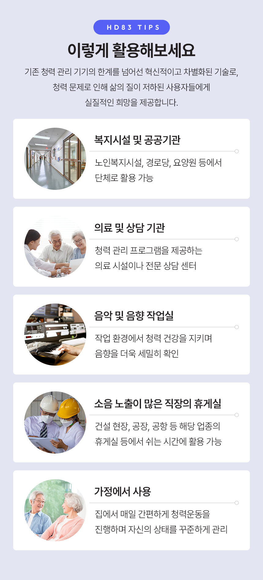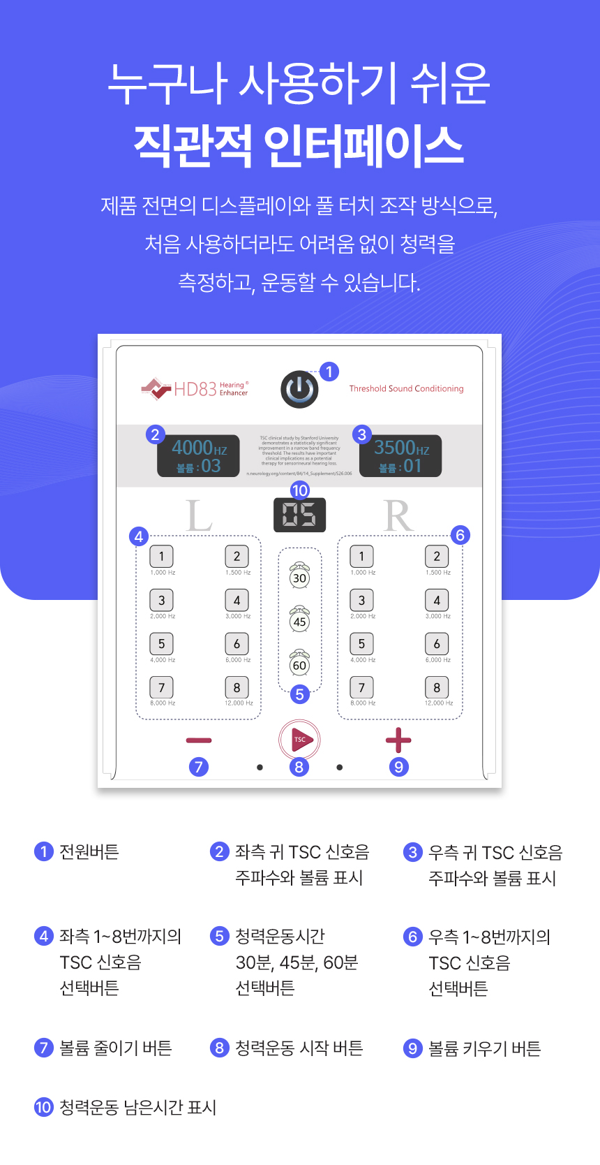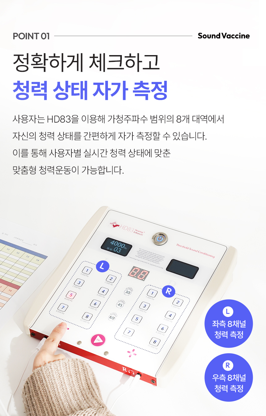 이번 펀딩을 통해 HD83 청력운동기구를 더 많은 분들께 제공하고자 합니다. HD83은 간편한 원터치 조작과 OLED 디스플레이를 통해 누구나 쉽게 사용할 수 있도록 설계되었으며, 주파수 기반의 맞춤형 청력운동 기능을 제공합니다. 특히, 병원 방문 없이 독자적인 TSC 기술을 활용해 가정에서도 효과적으로 청력 건강을 관리할 수 있습니다.