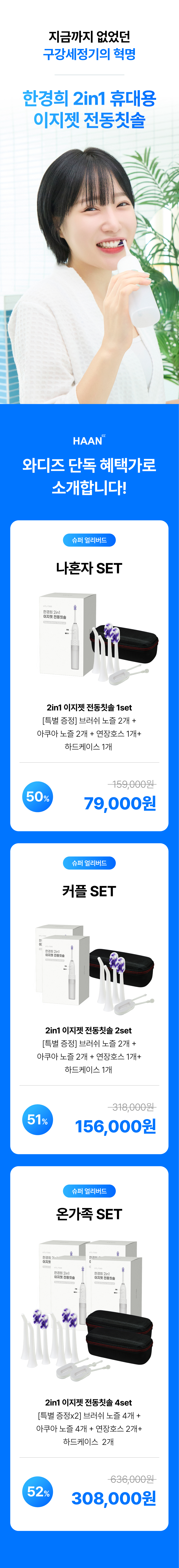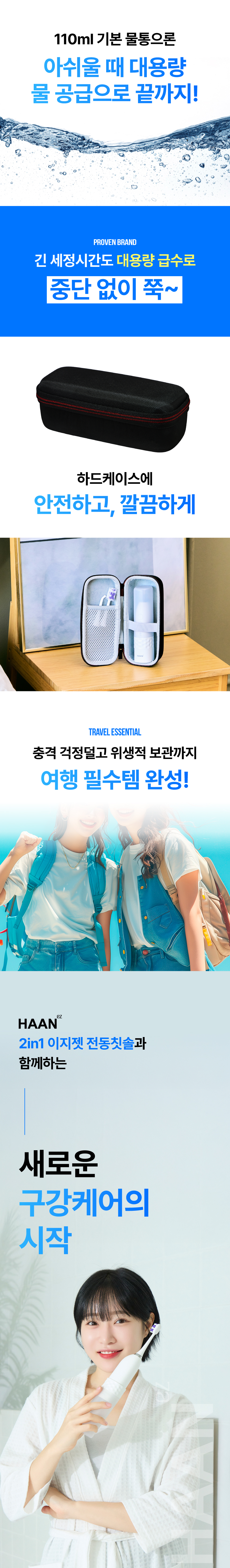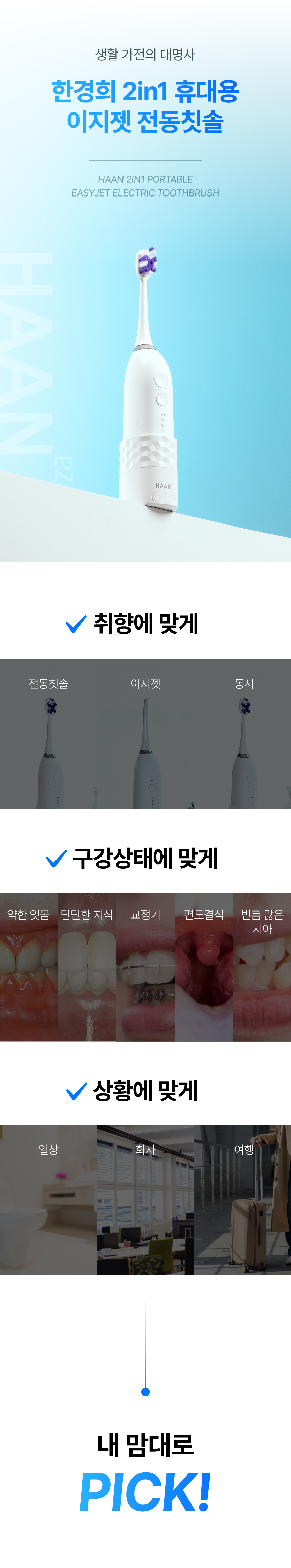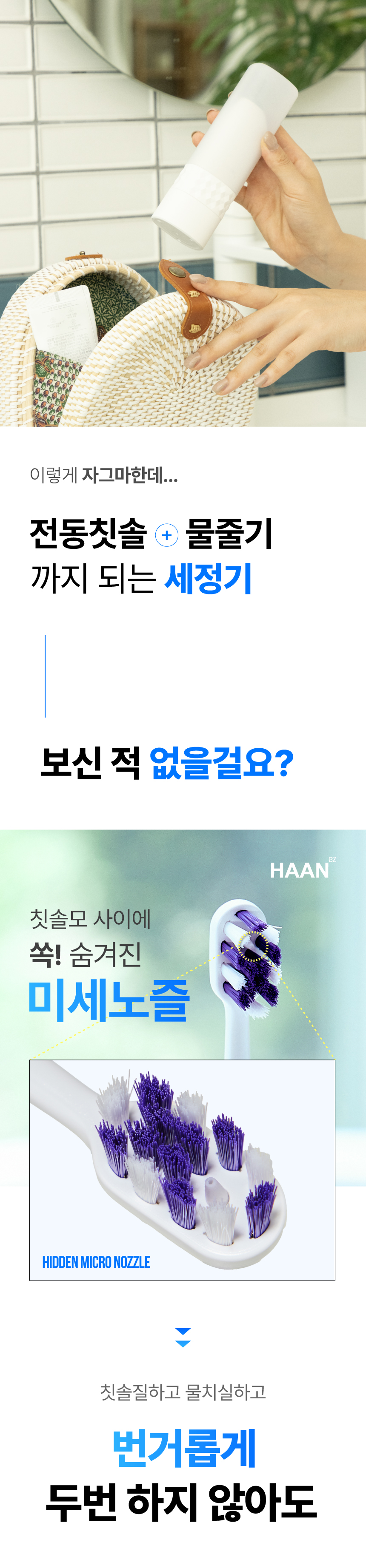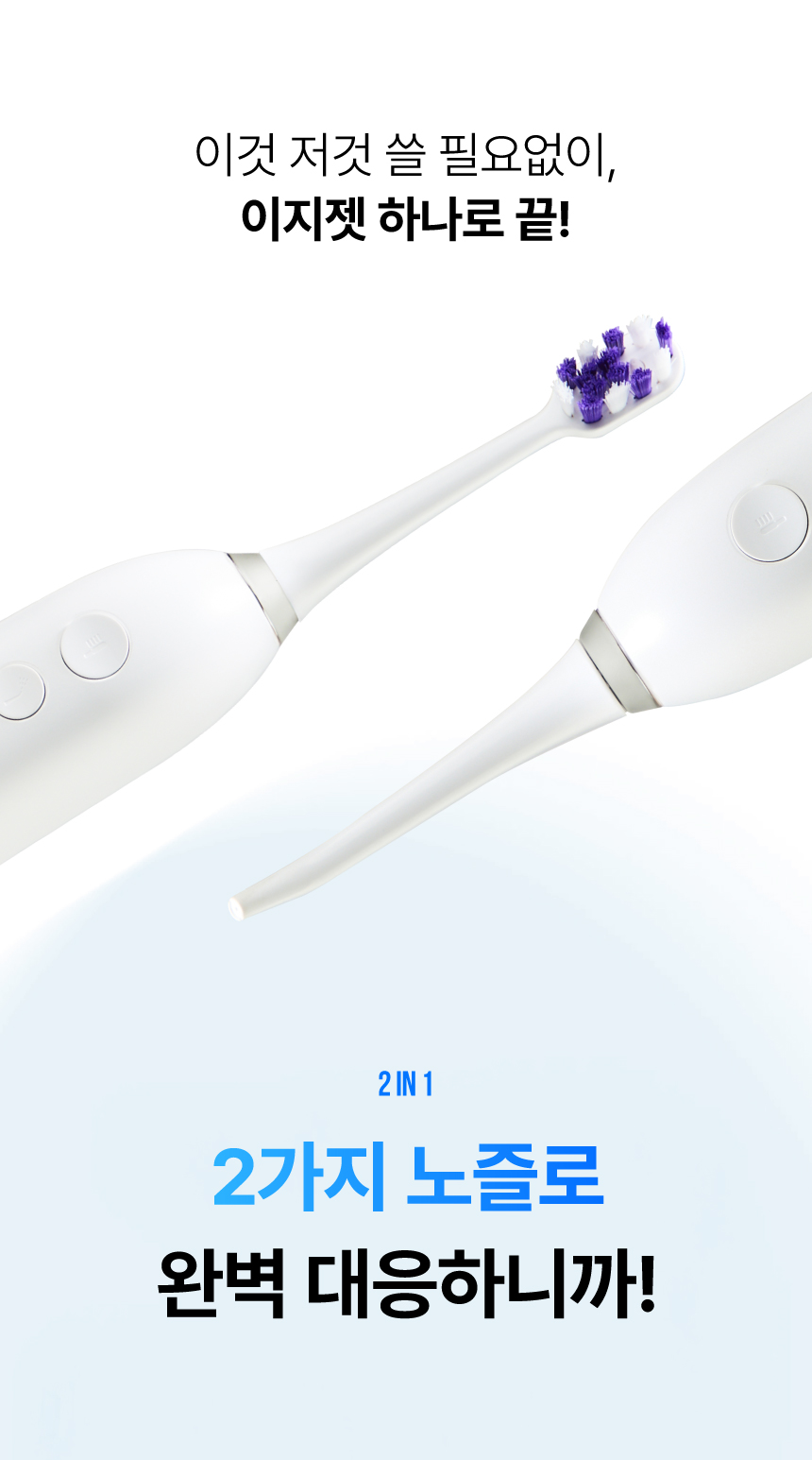 주식회사 더뉴원은 항상 새로운 것을 추구합니다. 그동안 치실, 전동칫솔, 구강세정기 등 다양한 구강청결용품들이 출시되었지만 부피, 디자인, 가격 등 어느 한 군데 아쉬워 선뜻 구매하지 못해왔던 고객님들의 마음을 바탕으로, 전동칫솔과 구강세정기가 결합하여 휴대성까지 높인 제품을 준비하게 되었습니다. 칫솔질로만은 부족한 부분을 채워주며 필요 기능만 쏙쏙 담고 있는 한경희 2in1 이지젯 전동칫솔을 소개해보고자 합니다.