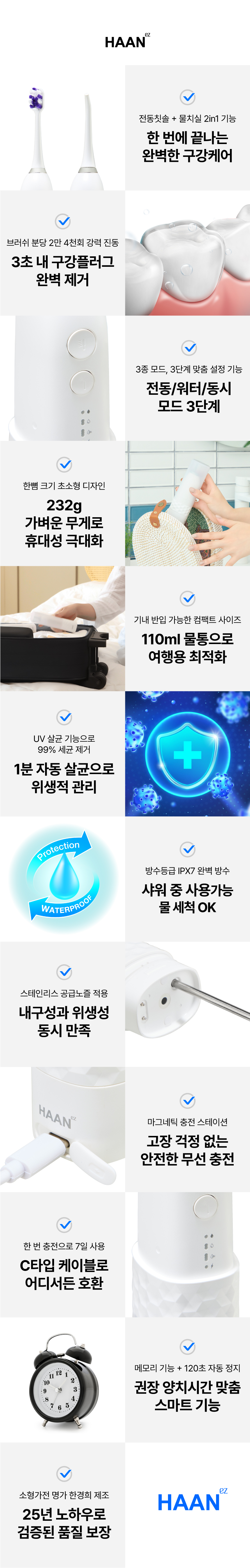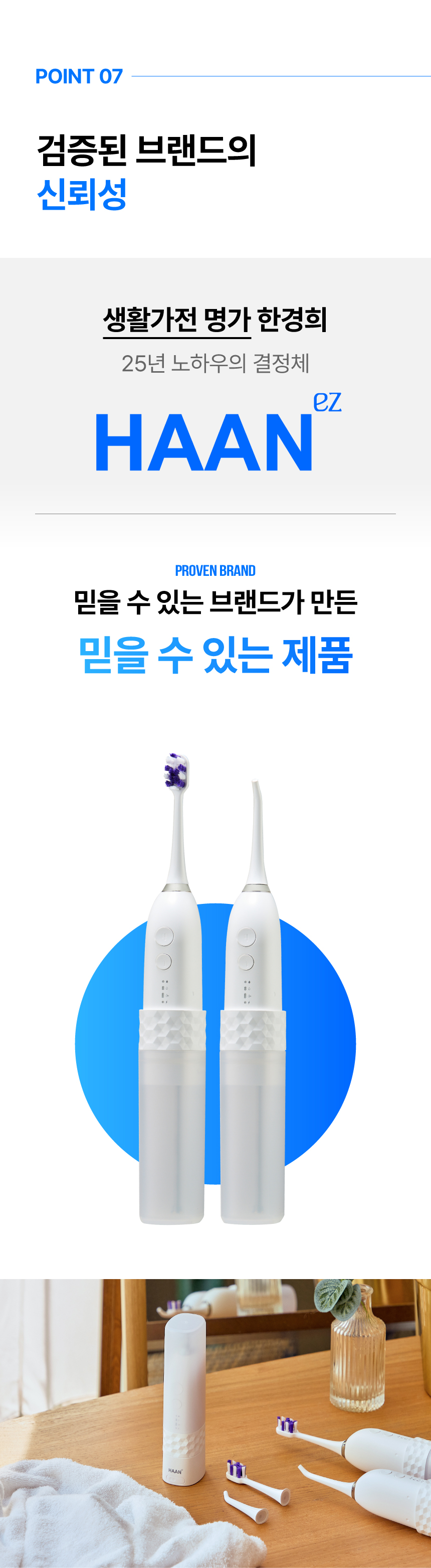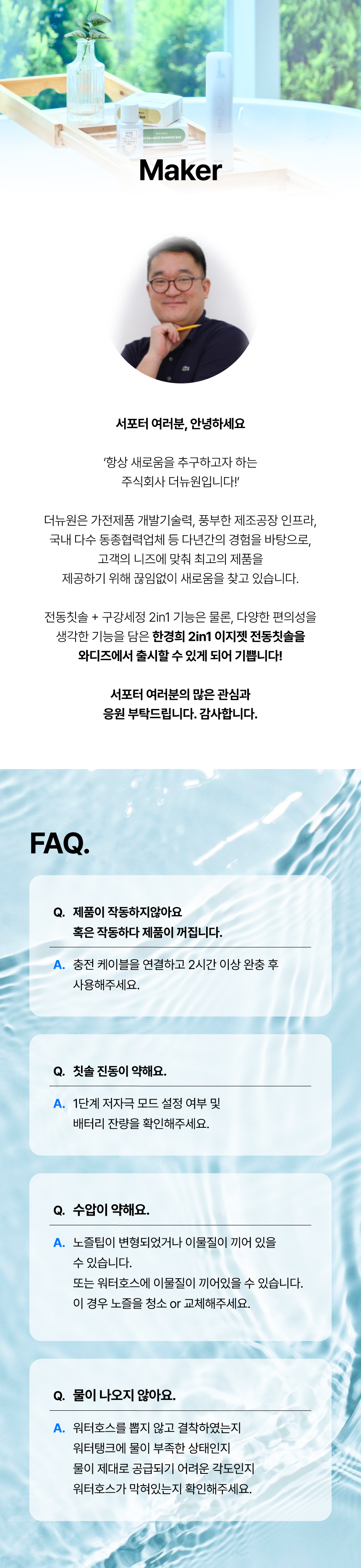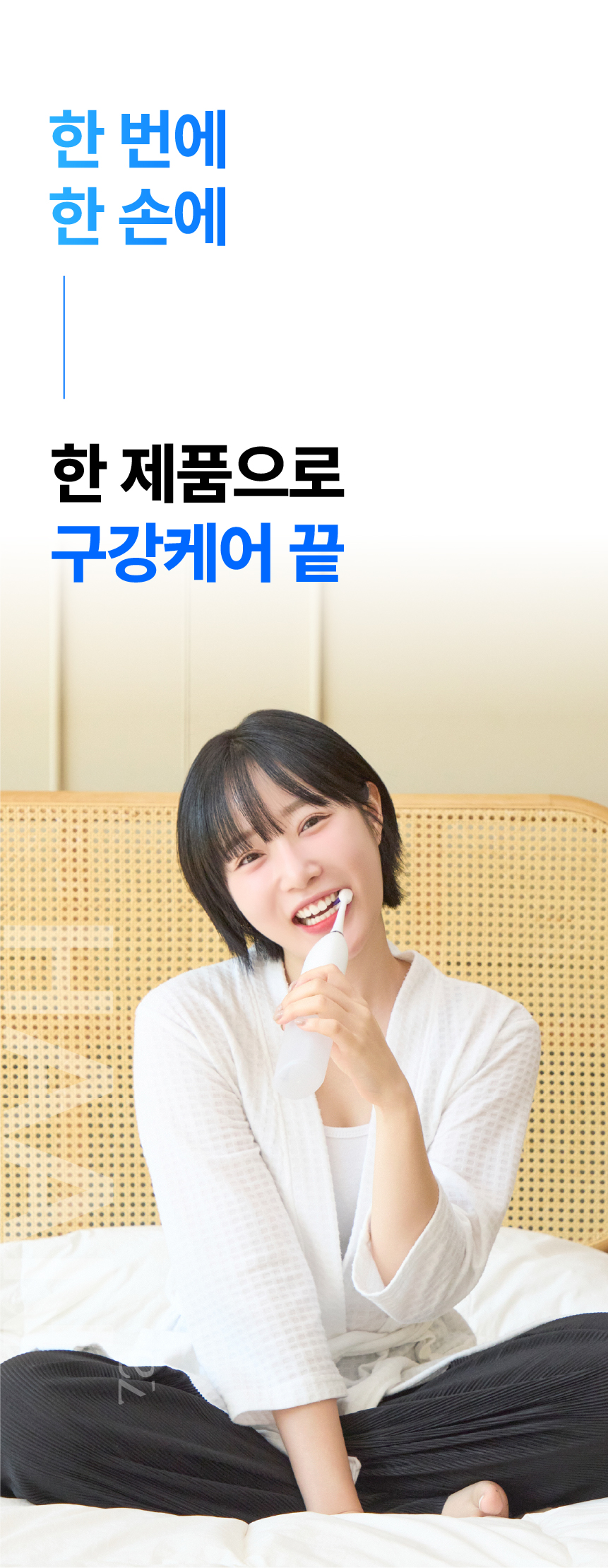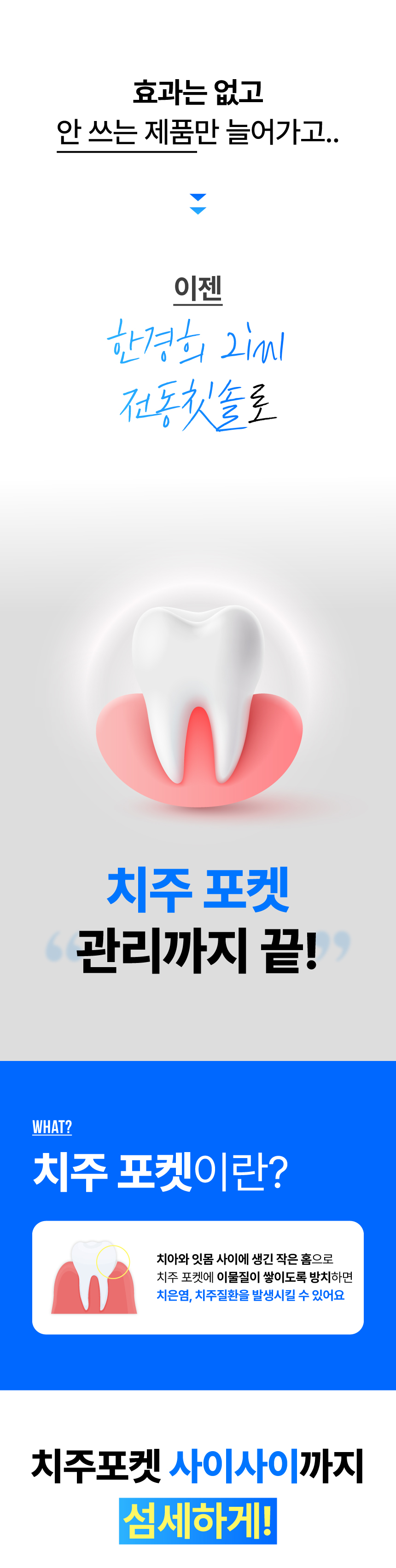 주식회사 더뉴원은 항상 새로운 것을 추구합니다. 그동안 치실, 전동칫솔, 구강세정기 등 다양한 구강청결용품들이 출시되었지만 부피, 디자인, 가격 등 어느 한 군데 아쉬워 선뜻 구매하지 못해왔던 고객님들의 마음을 바탕으로, 전동칫솔과 구강세정기가 결합하여 휴대성까지 높인 제품을 준비하게 되었습니다. 칫솔질로만은 부족한 부분을 채워주며 필요 기능만 쏙쏙 담고 있는 한경희 2in1 이지젯 전동칫솔을 소개해보고자 합니다.