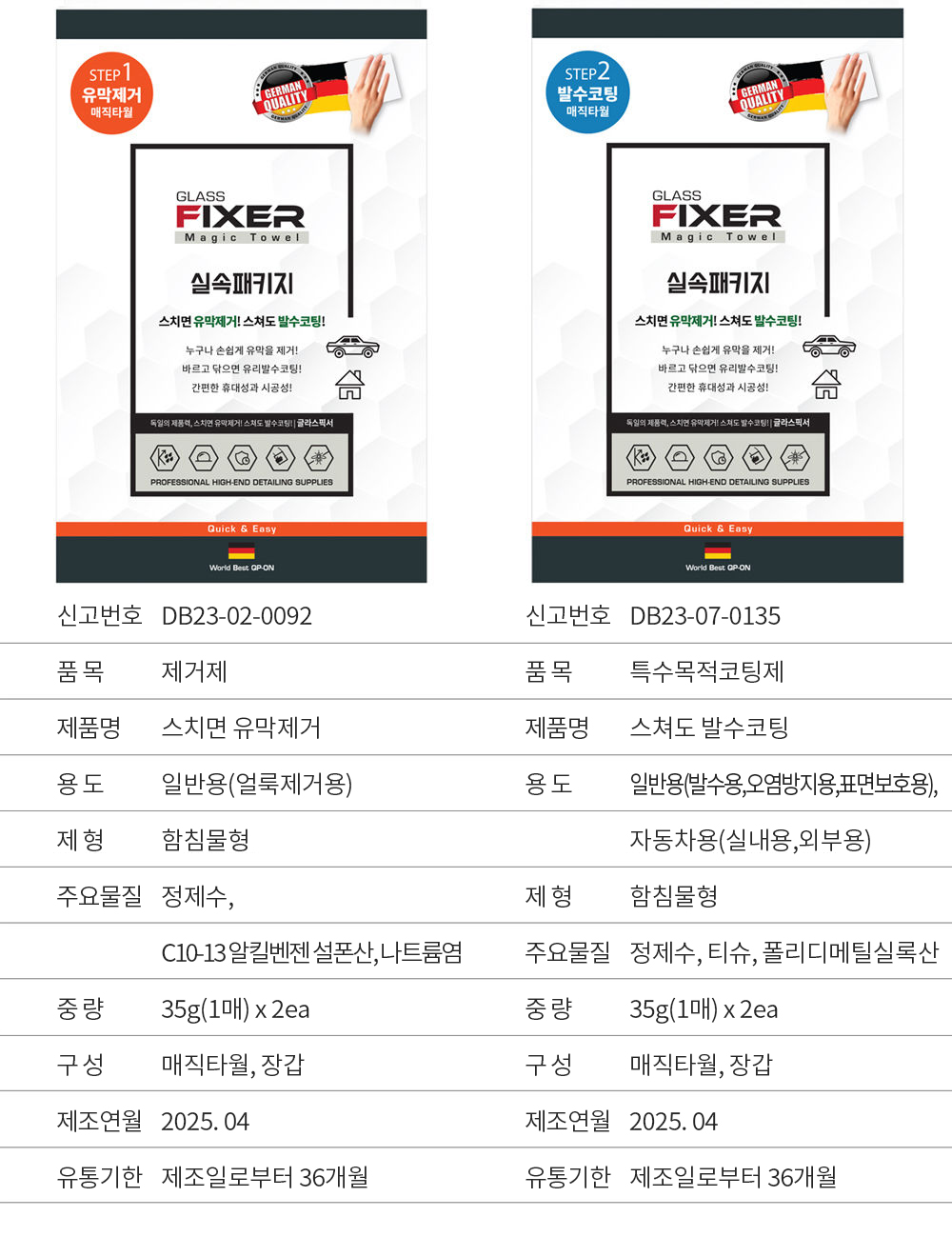 A. 발수코팅 매직타월은 실리시움과 폴리디메틸실록산이 주요 물질로 구성된 유리용 코팅제입니다. 실리시움이 유리 표면을 보호하게되며, 실록산 성분이 발수력과 지속성, 코팅의 안정성을 만들어 냅니다. 독일 QP.on UG 만의 진보적인 기술력으로 유리의 표면보호, 발수, 지속성, UV코팅 작업을 남녀노소 누구나 모두 손쉽고 간편하게 할 수 있습니다.