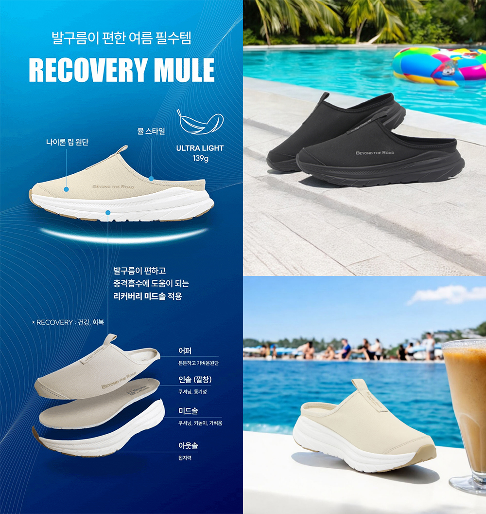 깃털처럼 가벼운 139g 초경량 무게에, 발구름이편해 지친발에 휴식을 주는 리커버리 뮬.