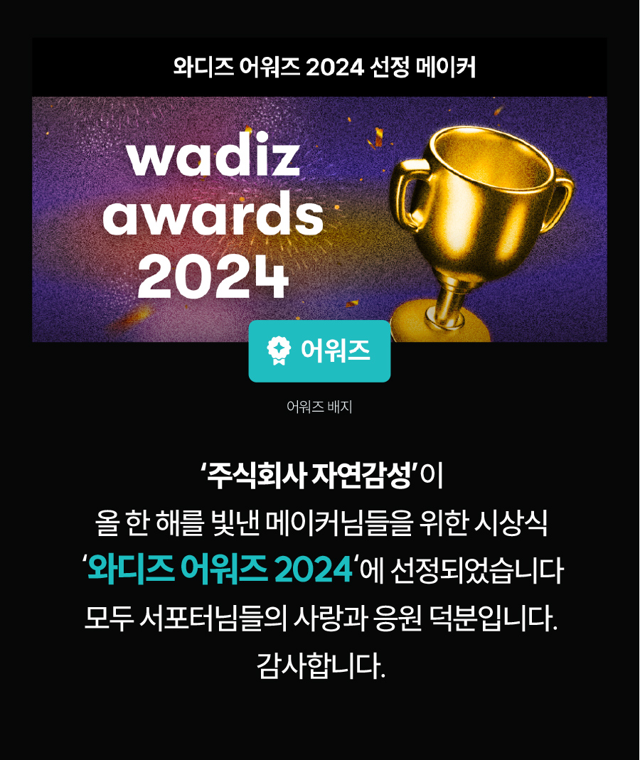 저희 자연감성은 "Eco-Friendly" 라는 슬로건으로 지속 가능한 환경을 만들기 위해 노력하고 있습니다. 이를 통해 서포터님들의 삶에 환경의 소중함과 행복의 가치를 전달하는 작은 매개체가 되기 위해 노력하고 있습니다.