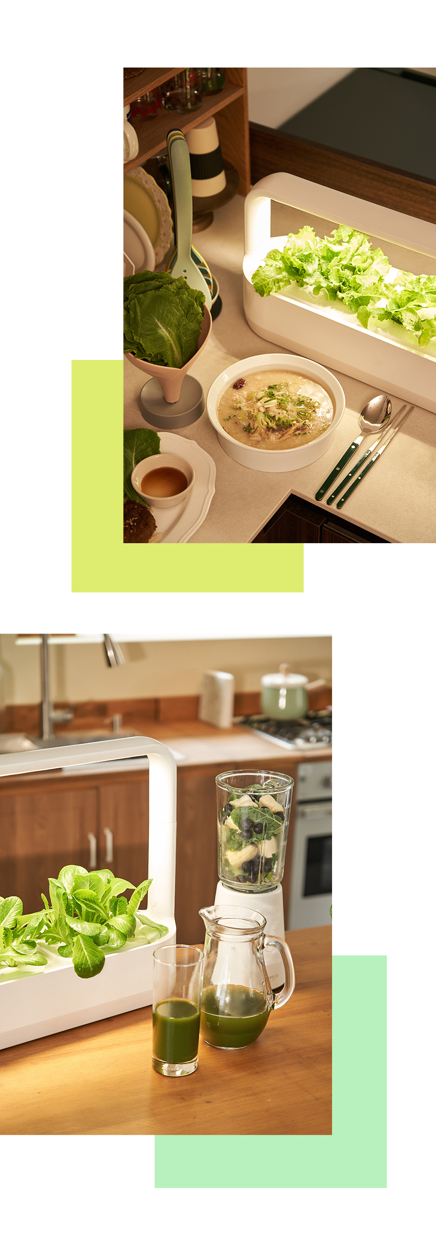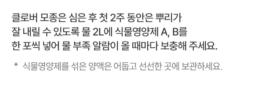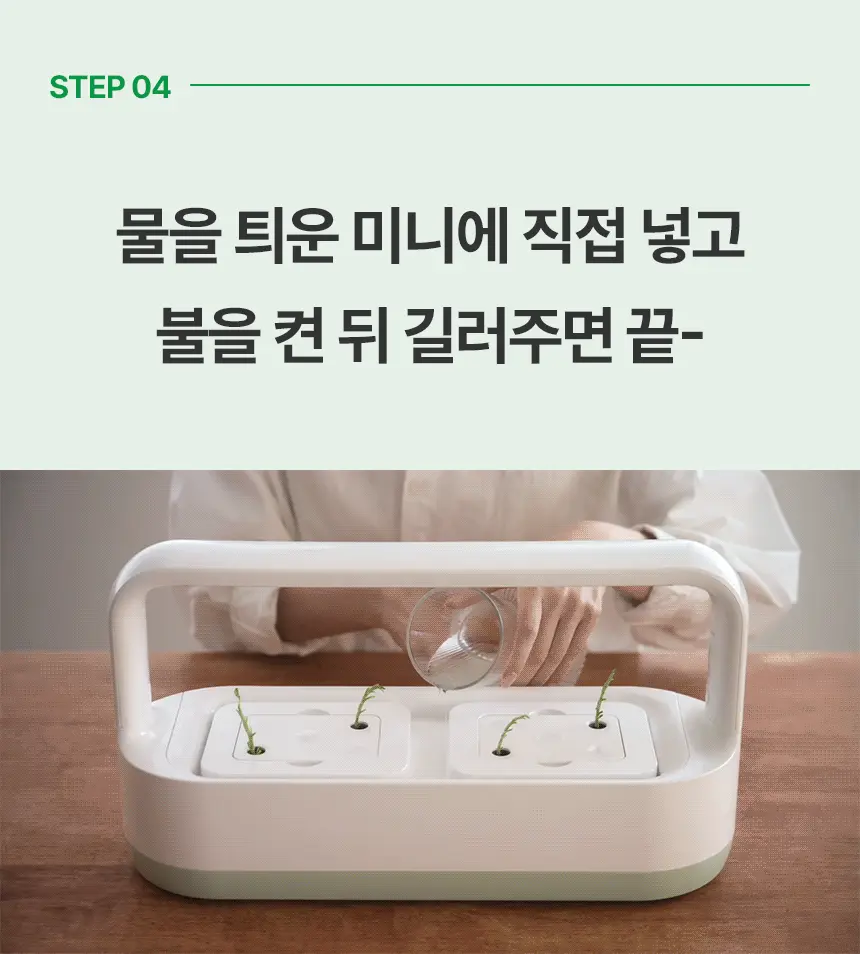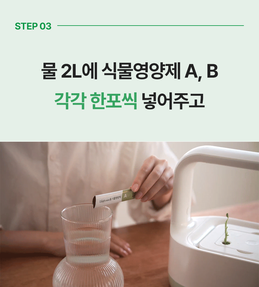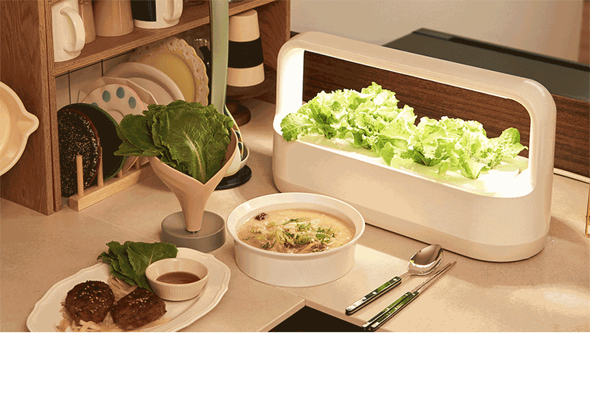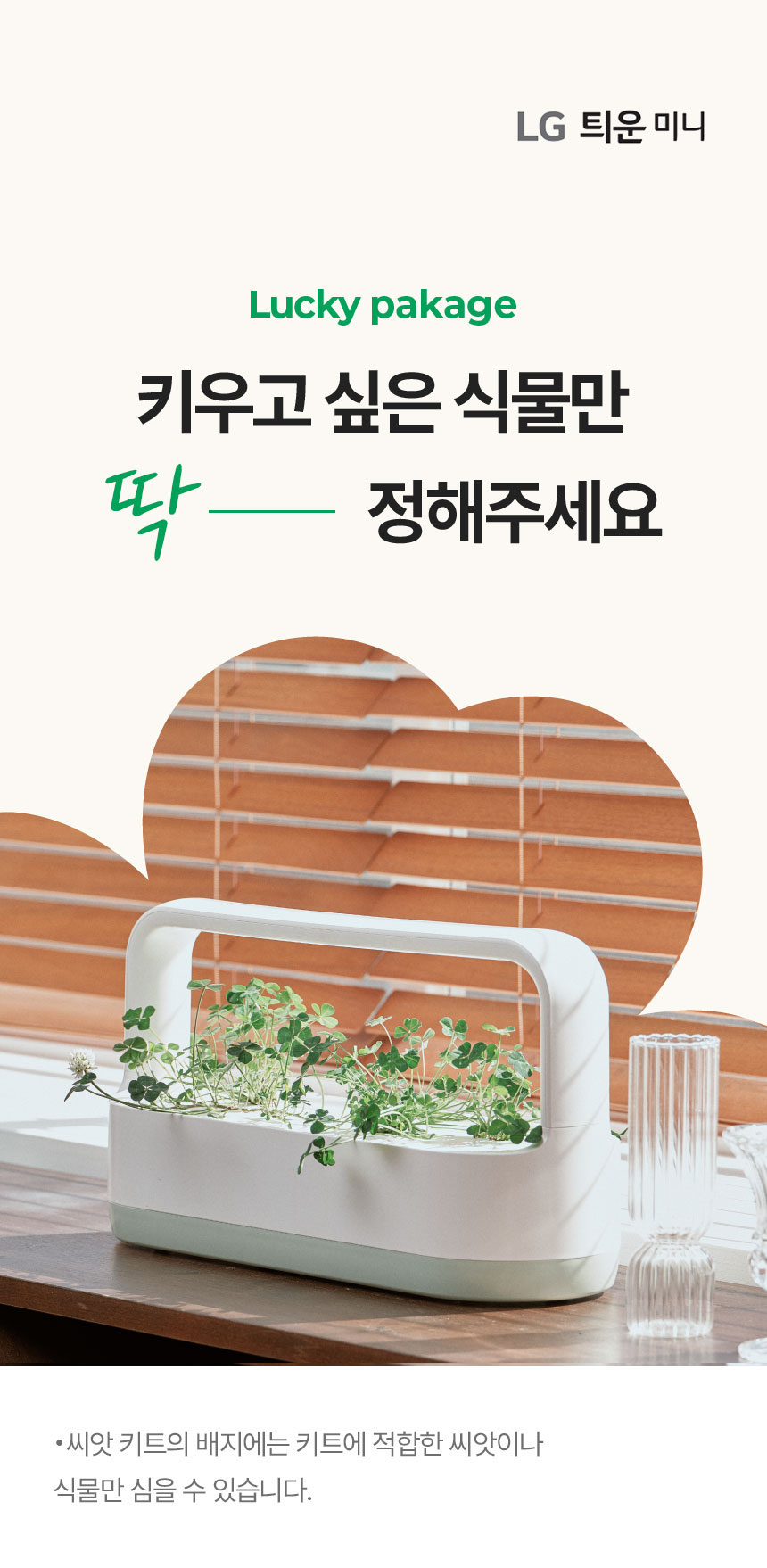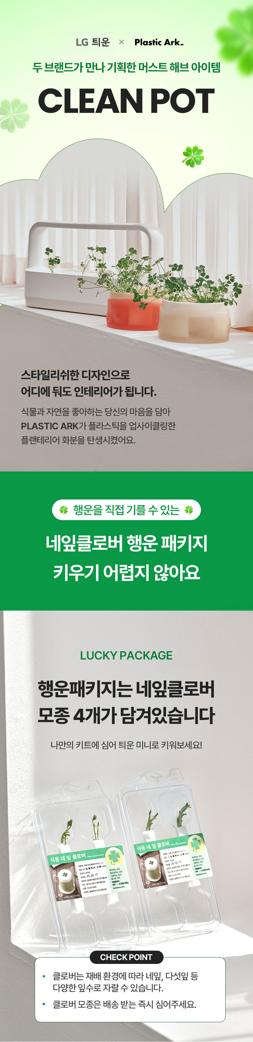 메인 오더 구성으로는 틔운 미니 본품과 틔운 미니에서 키울 수 있는 작물을 그대로 화분에 옮겨서 심으실 수 있는 CLEAN POT 전용 화분이 제공되며, 추가로 행운의 네잎클로버 모종과 나만의 키트 패키지가 증정됩니다.