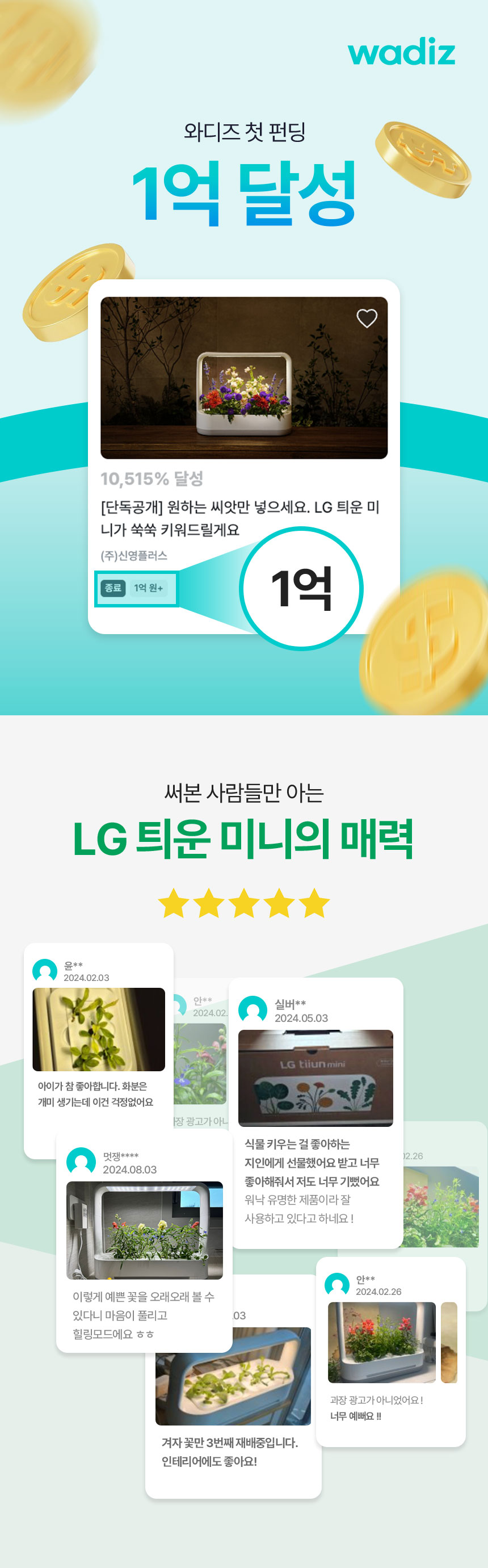 신영플러스는 다양한 식물 생활을 추구하는 틔운 '찐팬'을 확대하고자, 얼리어답터가 모두 모여있는 '와디즈'에서 다시 펀딩을 진행하게 되었습니다.