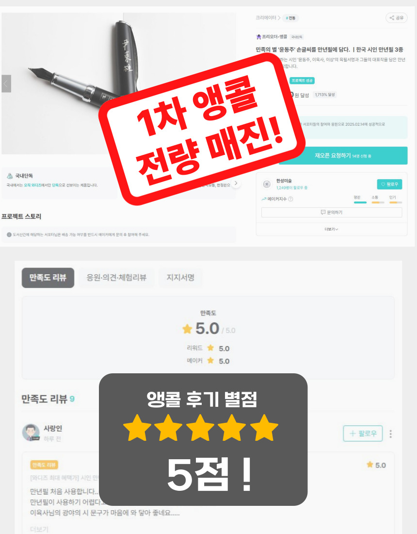 만년필 리워드의 각인은 손으로 쓴 것과 같은 느낌을 내기 위해 원고지 칸과 정확히 맞추어 글자가 배치되지 않았습니다. 따라서, 해당 부분은 하자에 해당하지 않습니다.