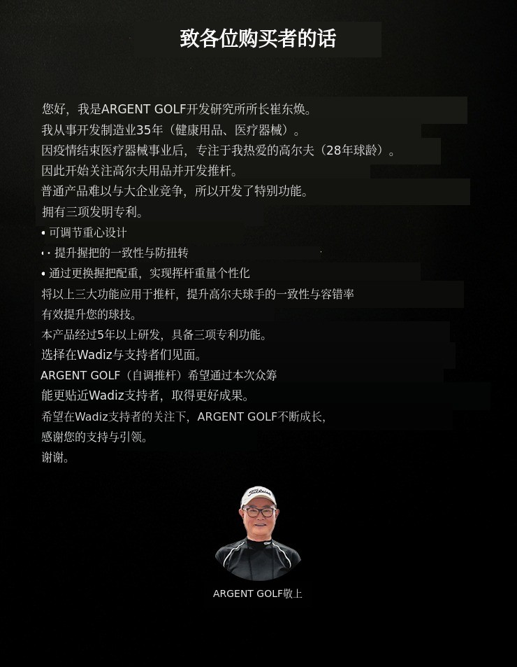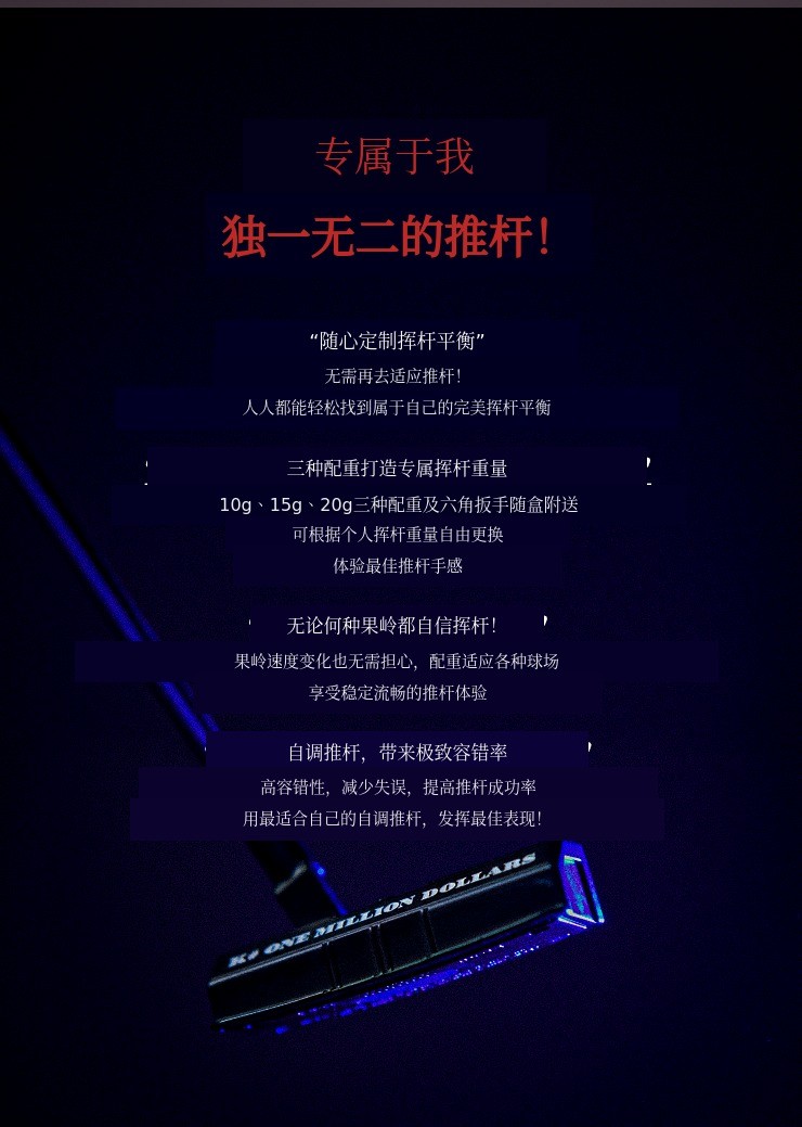 1. ⛳ 自调重心推杆 - 可调重心提升个性化推杆精准度 2. 🏌️♂️ 推杆容错创新 - 零扭矩零弹跳技术支持稳定击球 3. 🎁 限时折扣优惠 - 众筹平台独享最高57%折扣