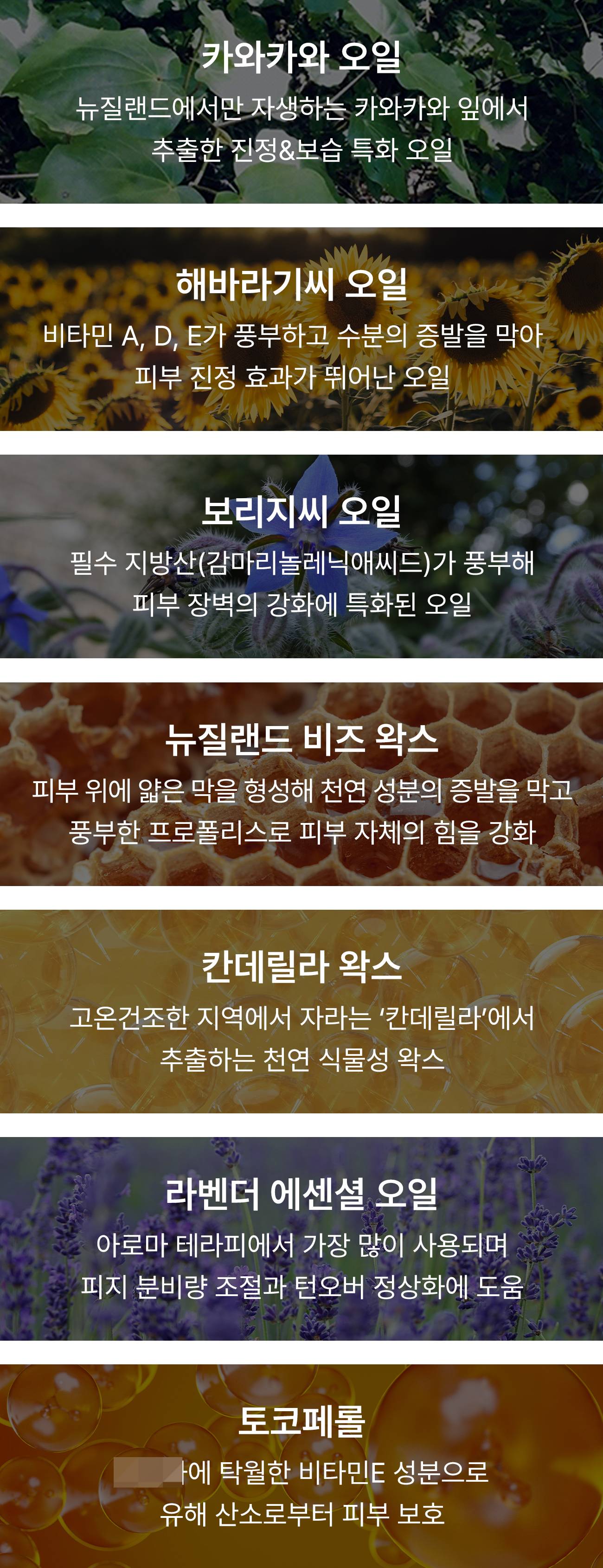 비타민 A, D, E가 풍부해요. 기본적으로 수분의 증발을 막아서 카와카와 오일이 충분히 흡수되는 걸 도와요. 덕분에 피부가 더 빠르게 진정되는데 속도를 붙여줍니다.