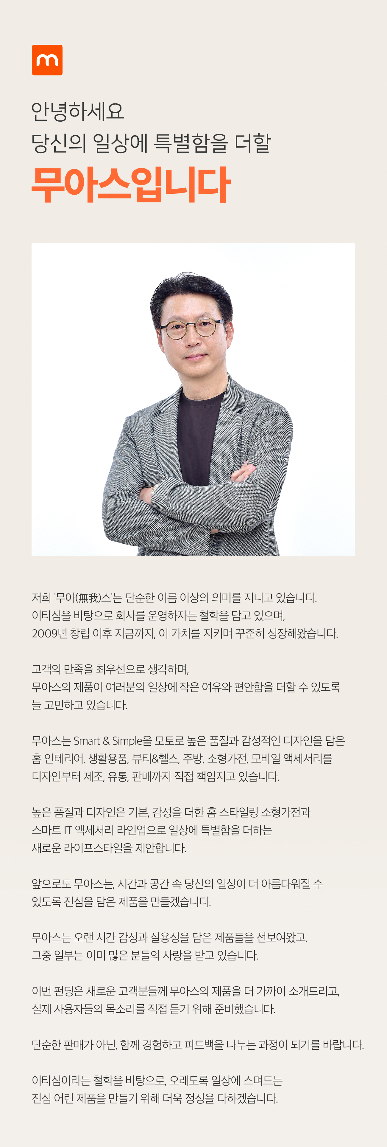 무아스는 오랜 시간 감성과 실용성을 담은 제품들을 선보여왔고, 그중 일부는 이미 많은 분들의 사랑을 받고 있습니다. 이번 펀딩은 새로운 고객분들께 무아스의 제품을 더 가까이 소개드리고, 실제 사용자들의 목소리를 직접 듣기 위해 준비했습니다. 단순한 판매가 아닌, 함께 경험하고 피드백을 나누는 과정이 되기를 바랍니다. 이타심이라는 철학을 바탕으로, 오래도록 일상에 스며드는 진심 어린 제품을 만들기 위해 더욱 정성을 다하겠습니다.