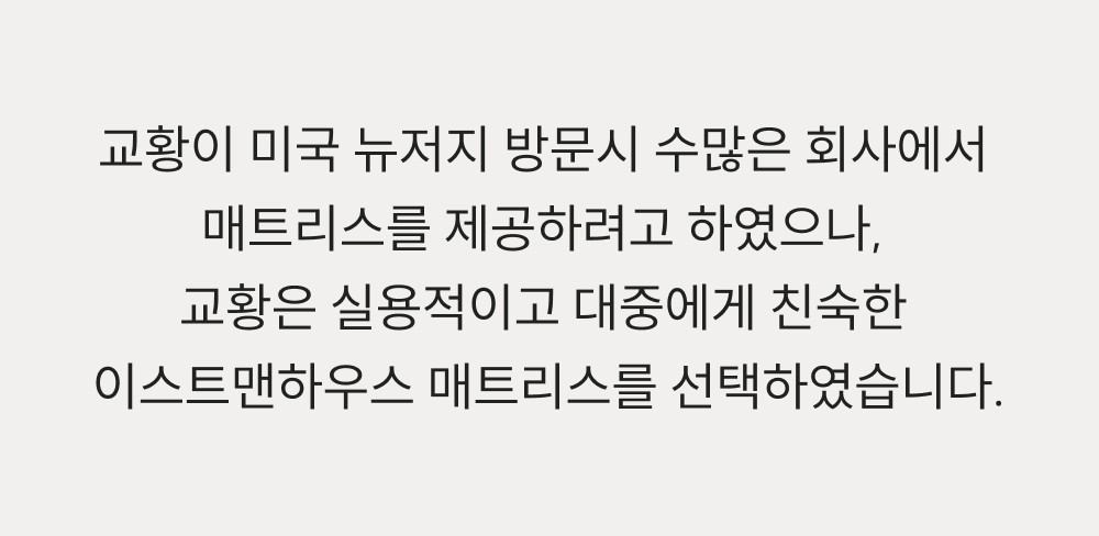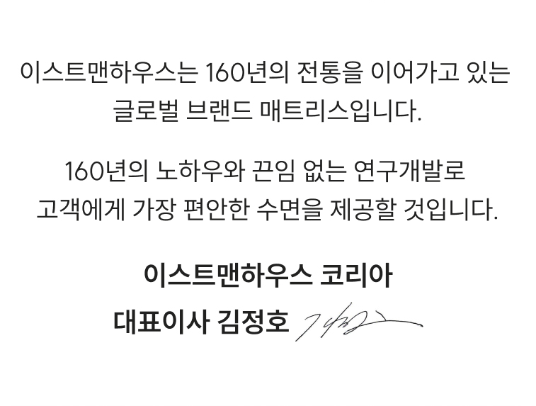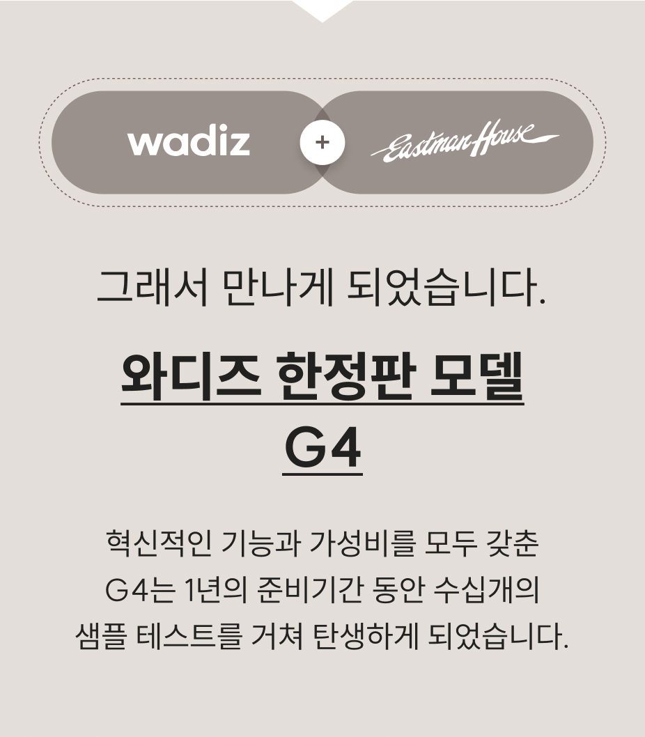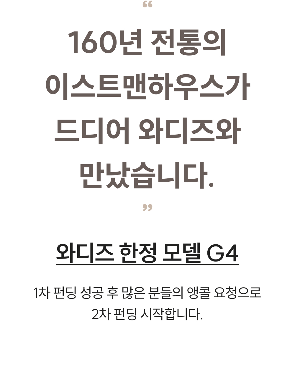 지난 10년 동안 이스트맨하우스는 오프라인으로 고객님들을 만나왔습니다. 하지만 한국 진출 10주년이 되는 2025년 에는 온라인으로도 고객님들을 만나뵈야 겠다고 생각했고 그렇다면 우리의 혁신적인 기능을 갖고 있는 G4를 제대로 알아봐 주실 고객분들은 어디계실까? 이 질문에 고민없이 단번에 와디즈를 선택하게 되었습니다. 매트리스에도 품격이 있고 전통이 있습니다. 이제 와디즈를 통해 160년 전통의 이스트맨하우스를 경험해 볼 수 있는 기회가 되기를 바랍니다