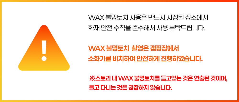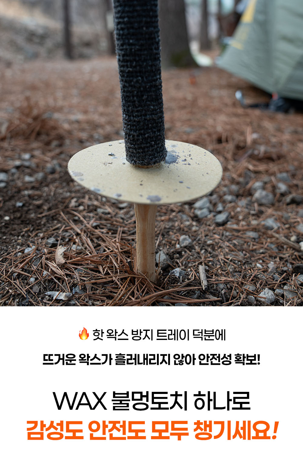 바람이 많이 불 경우 파라핀이 바람에 날려 바닥에 떨어질 수 있습니다. 바람이 없는 환경에서는 파라핀이 많이 흘러내리지 않지만 바람이 세다면 파라핀이 바람에 날려 많이 떨어질 수 있으니 조심하여 주세요. - WAX 불멍토치를 들고 이동하는 것은 권장하지 않습니다.