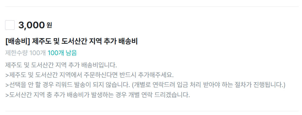 제주도 및 도서산간 지역의 경우 3,000원의 추가 배송비가 발생합니다. 펀딩 참여 시 리워드 중 '제주도 및 도서산간 지역 추가 배송비' 를 선택하여 주세요. 미 선택 시 배송이 늦어질 수 있습니다. (미 선택 시 발송 전 전화연락 후 입금확인 요청드립니다.) 도서산간 지역의 경우 추가 비용이 발생할 수 있습니다. 해당 경우 전화 연락 드립니다.