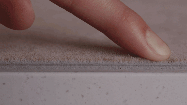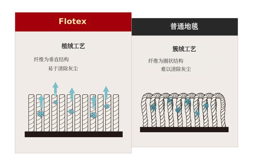 普通地毯的纤维结构为环形(Loop Pile),灰尘容易卡在纤维之间,即使清洁也难以彻底去除灰尘。此外,使用一段时间后容易起球,难以长时间保持整洁。Flotex通过以下方式改善了这些缺点植绒(Flocking)工艺 进行了改进!