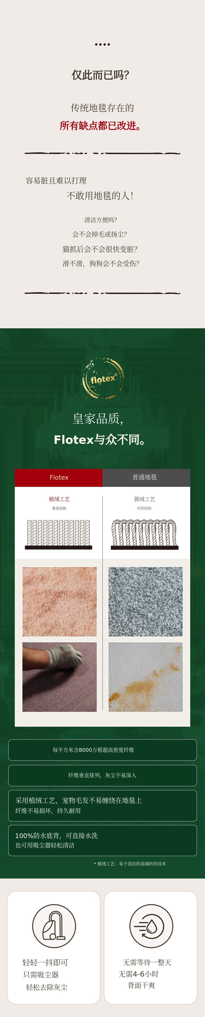 即使在孩子饮料、宠物失误等日常各种情况下保持干净卫生的空间 这是只有Flotex才有的优点。