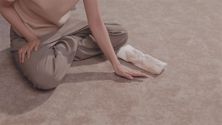 用无痕胶带粘在地板上,搬家或拆除时也能无损地取下。拆下的地板材可水洗、保存并重复使用。