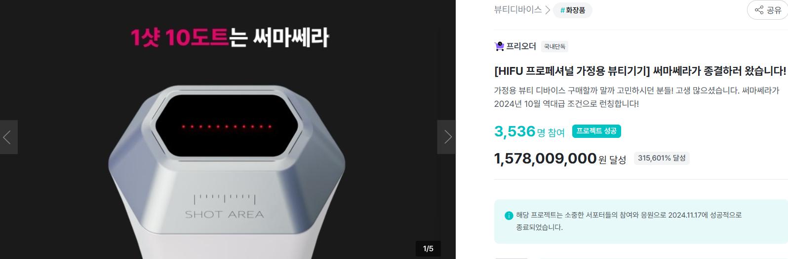 써마쎄라 하이푸샷 당시에도 1차 펀딩 15억 7천만원 2차 펀딩 11억 5천만원의 서포터님들의 압도적인 지지로 단 2회 펀딩액 27억원을 달성하며 와디즈 뷰티부문에서 1위를 달리고 있습니다.