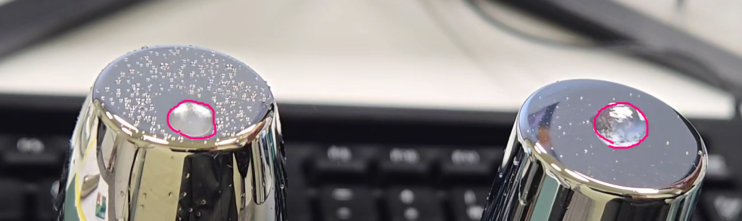 안정성있게 고른 출력과 1.5w/cm2 정도의 강한 출력(기존 대비 약 20% 증가)일 때에 어떠한 현상이 발생하냐면요! 아래처럼 물방울이 솟구치는 현상이 나타납니다.