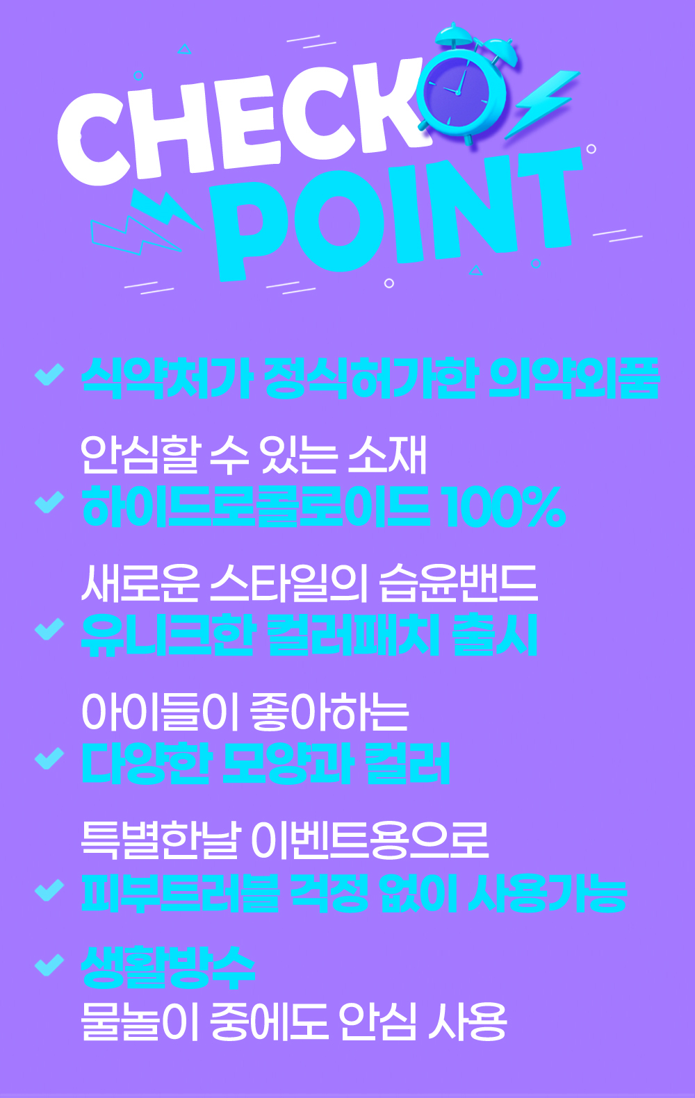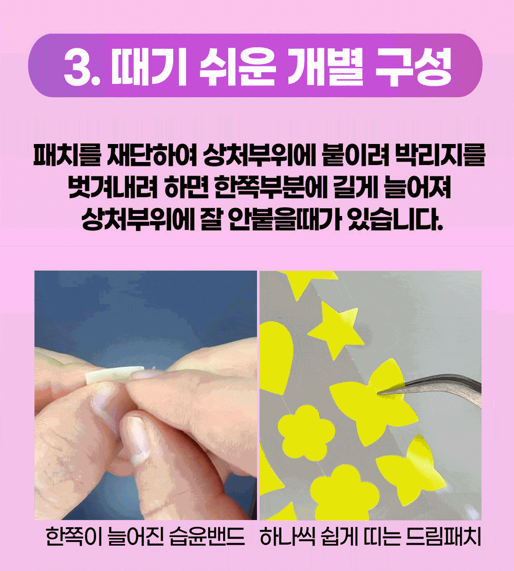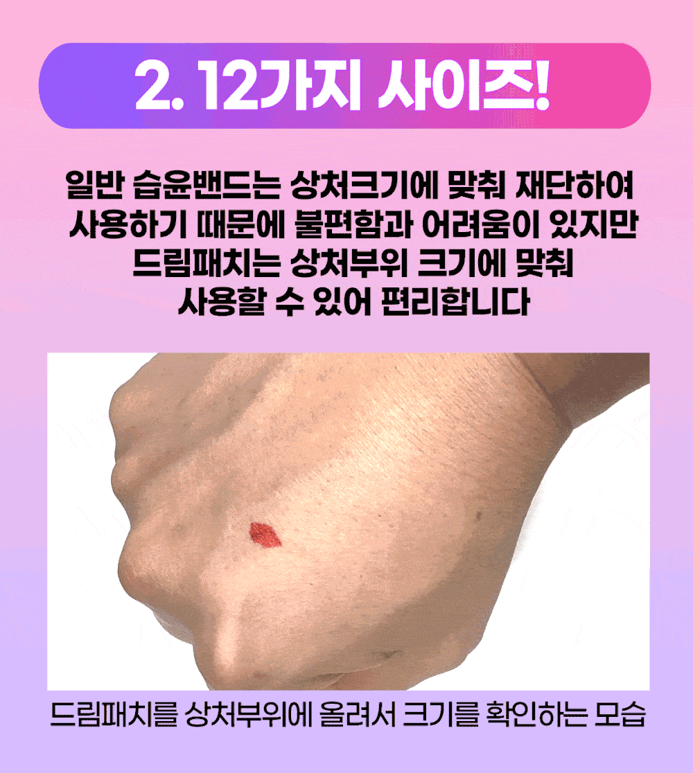 드림패치는 일반 상처보호패치와 동일한 하이드로콜로이드 100% 성분으로 제작된 상처패치 입니다. 식약처에 정식 허가 된 제품으로 기능과 성능은 일반 습윤밴드와 같으나 모양과 색깔이 있어 다채로운 스타일 연출에 용이합니다. 다친 부위가 거슬리는 분들에게 드림패치를 붙이며 기분 전환에도 큰 도움을 받을 수 있습니다. 얼굴과 몸에 난 상처에 모두 사용가능하며 낱개 이중포장으로 사용도 용이합니다. 사용이 편리한 드림패치, 이제 우리집 필수템으로 제격입니다. 항상 응원해주시는 서포터님께 감사드립니다.