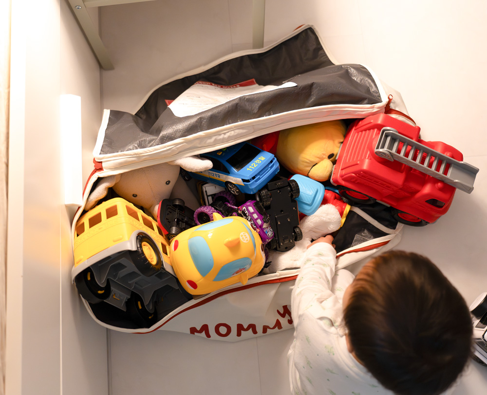 베드가드 천장에는 깊은 주머니가 있습니다. 이 부분은 특히 아이들 손에는 절대 닿지 않는 부분인데 이 부분에 아기에게 자주 사용하는 기저귀와 같은 잔짐을 넣어둘 수 있습니다.