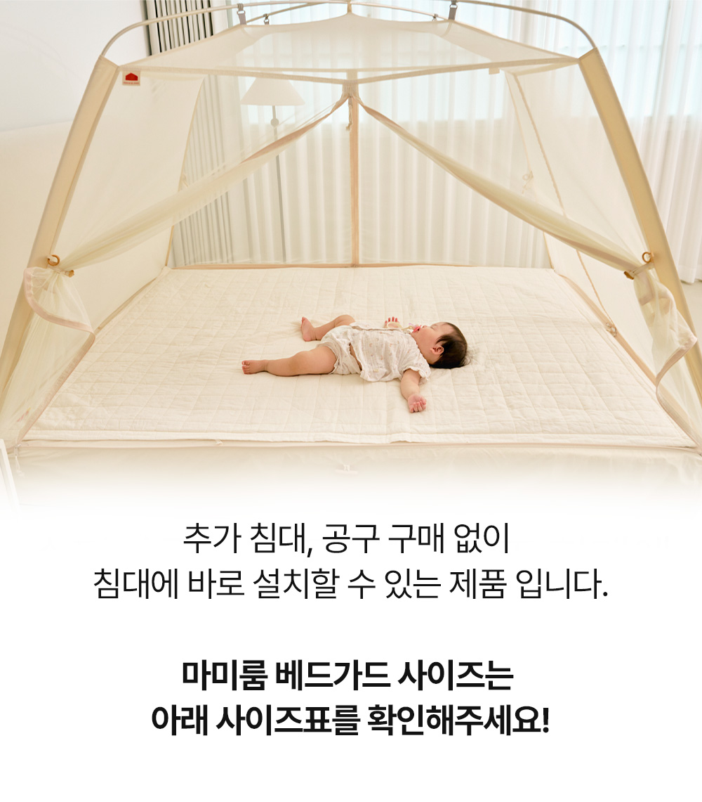 마미룸의 베드가드가 진짜 편한 이유는 바로 별도로 고가의 아기 침대를 살 필요 없이, 우리가 늘 사용하는 침대 위에 설치만 해주면 된다는 것이죠.