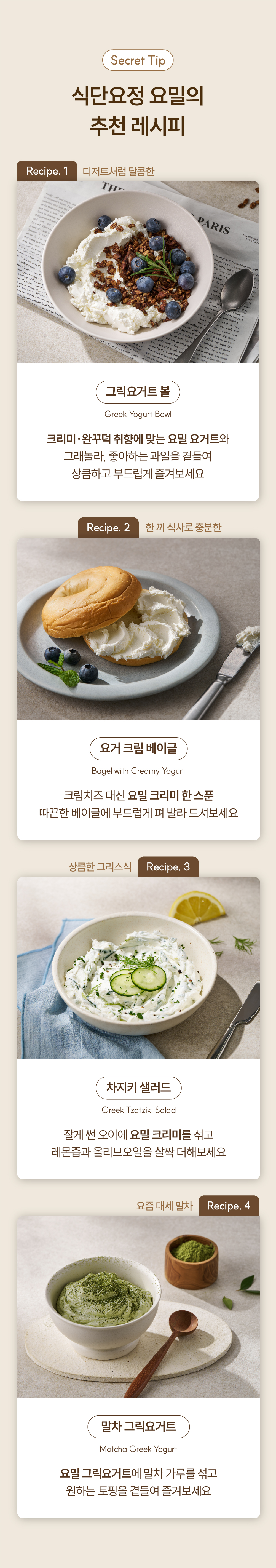 - 그릭요거트 : 유제품은 냉장보관이 필수입니다. 채소칸처럼 온도가 자주 바뀌지 않는 곳이면 더욱 좋아요.