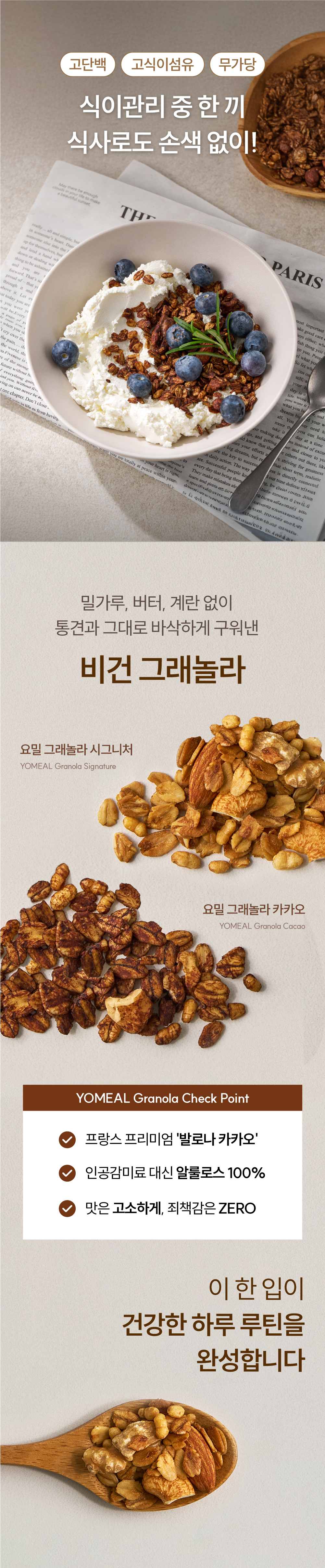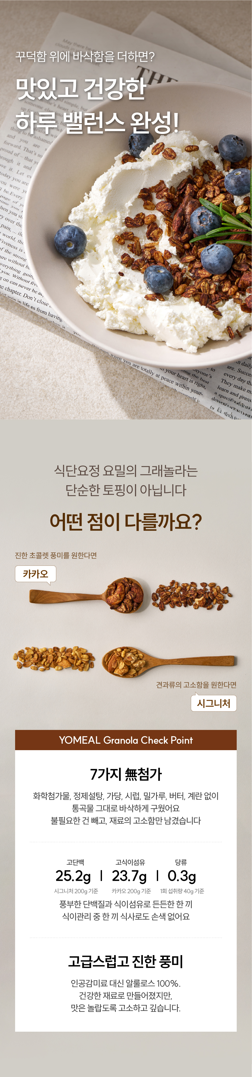 소비자 분들의 현명한 소비를 돕기 위한 대외적인 명분이 아니라, 그저, 판매하는 입장에서 거짓으로 소비자를 우롱하고 싶지 않습니다. 그래서, 식단요정 'YOMEAL'을 통해 '무가당 그릭요거트'와 '무가당 그래놀라'를 만들었습니다.