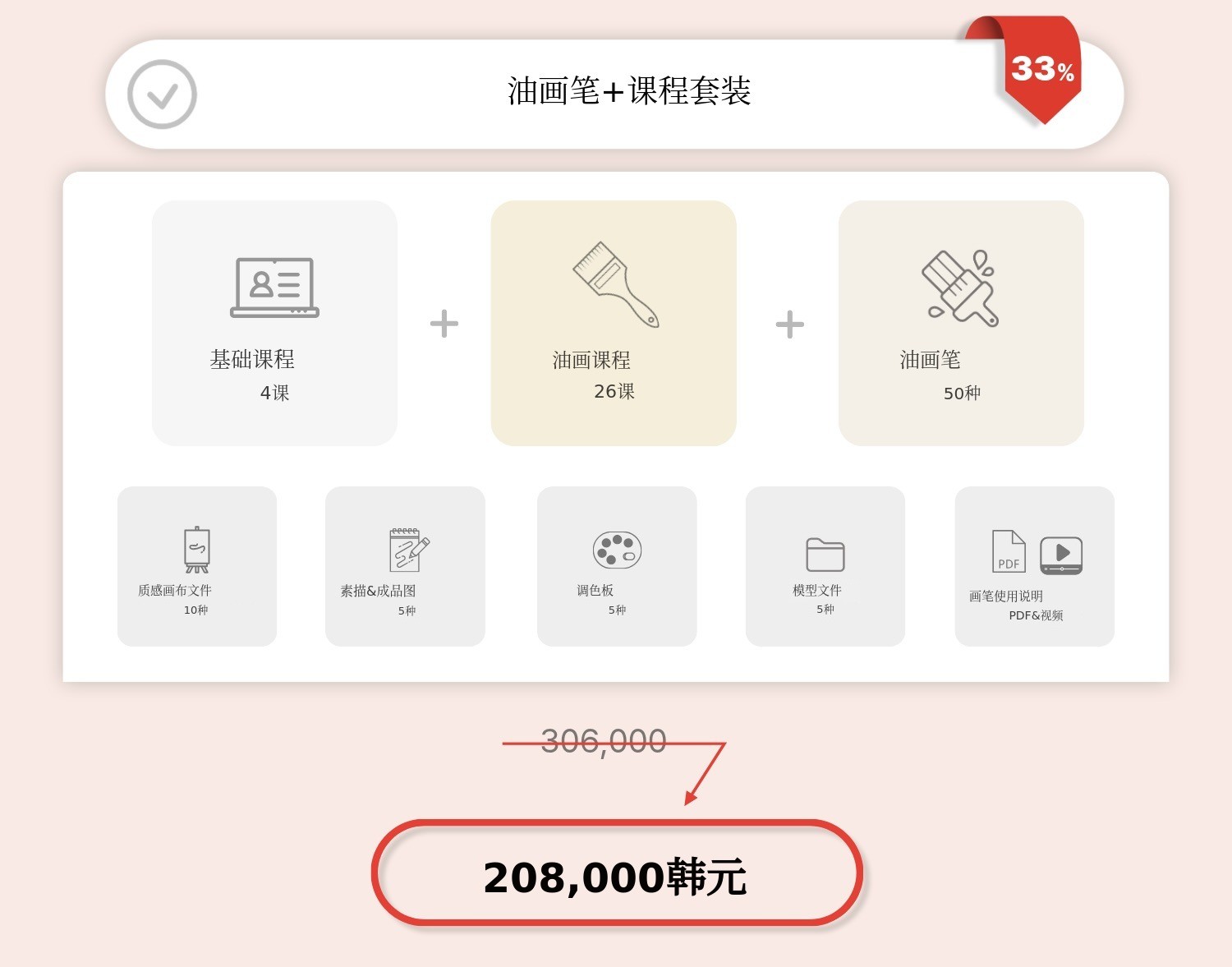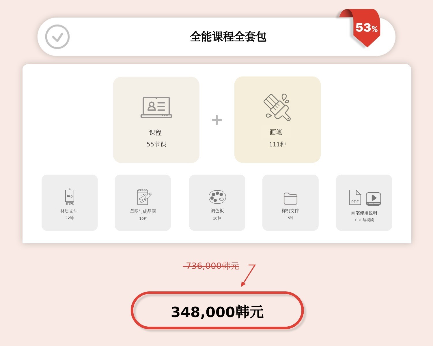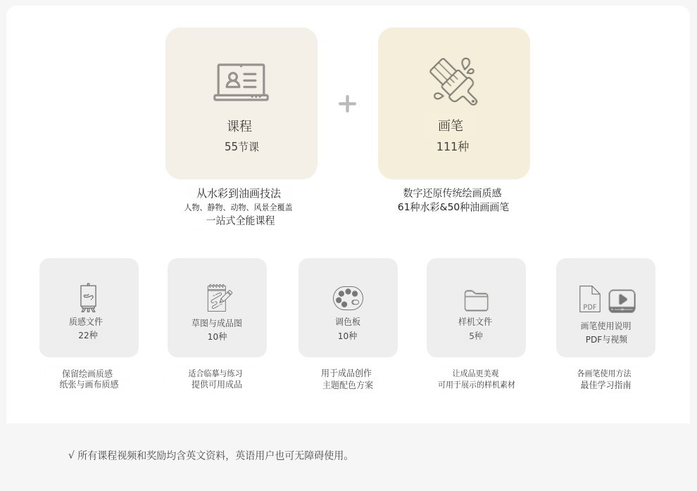 因此,这次我们准备了全新推出的水彩画笔在内的111种画笔,以及55节油画/水彩课程+材质、色彩调色板等全面的组合。