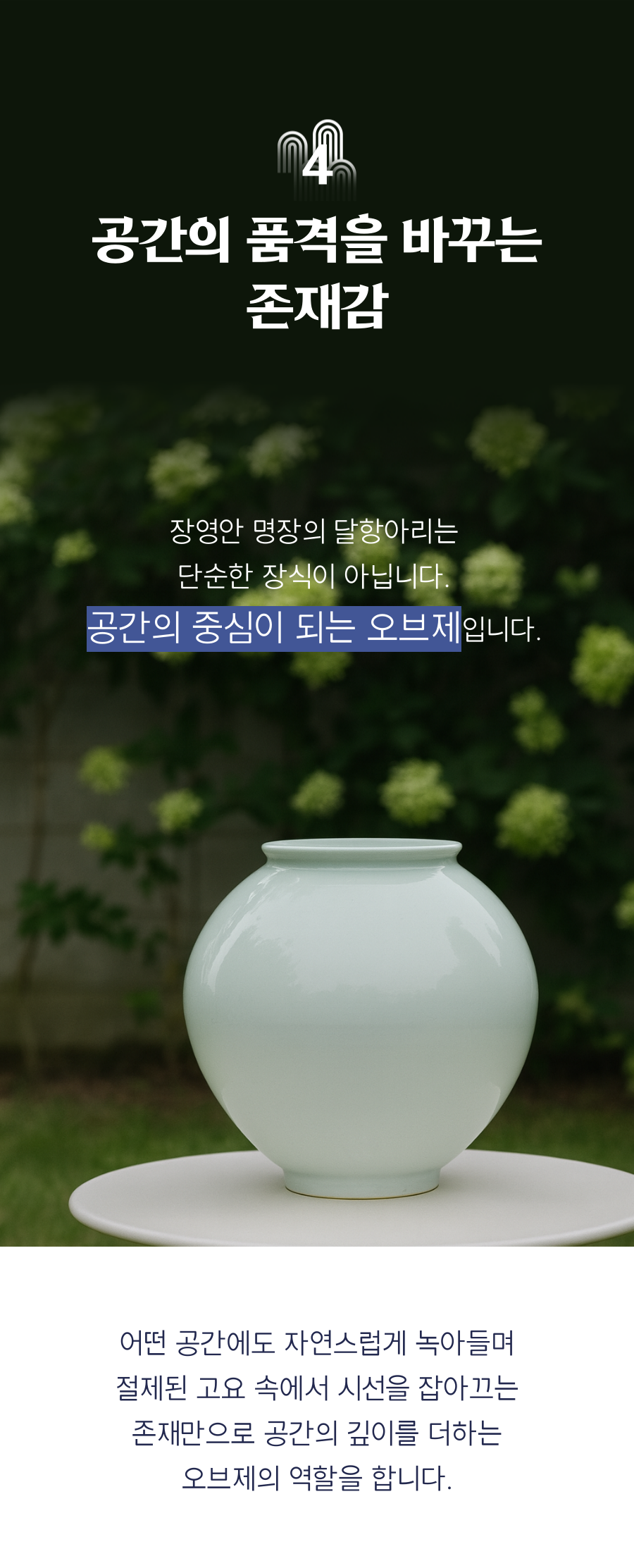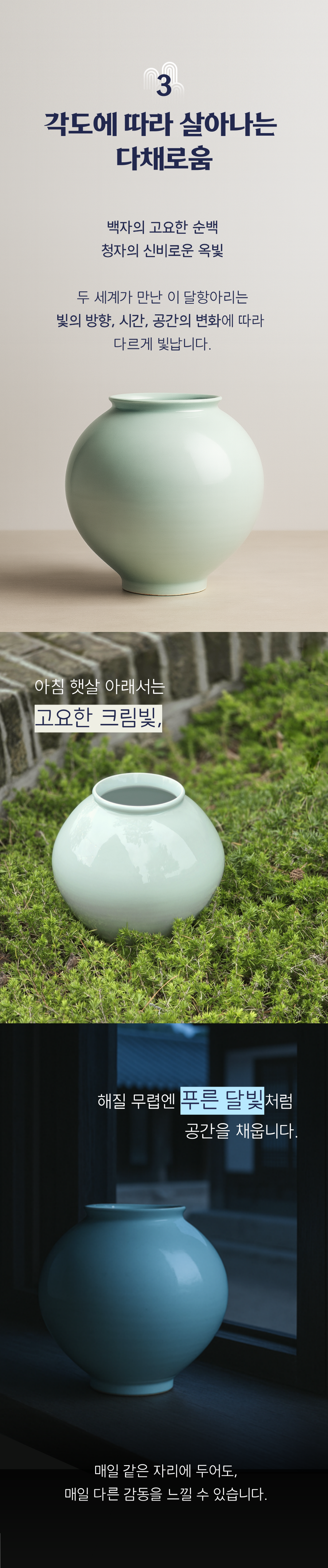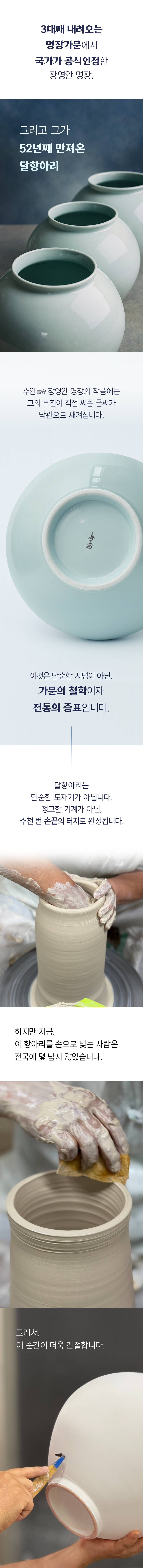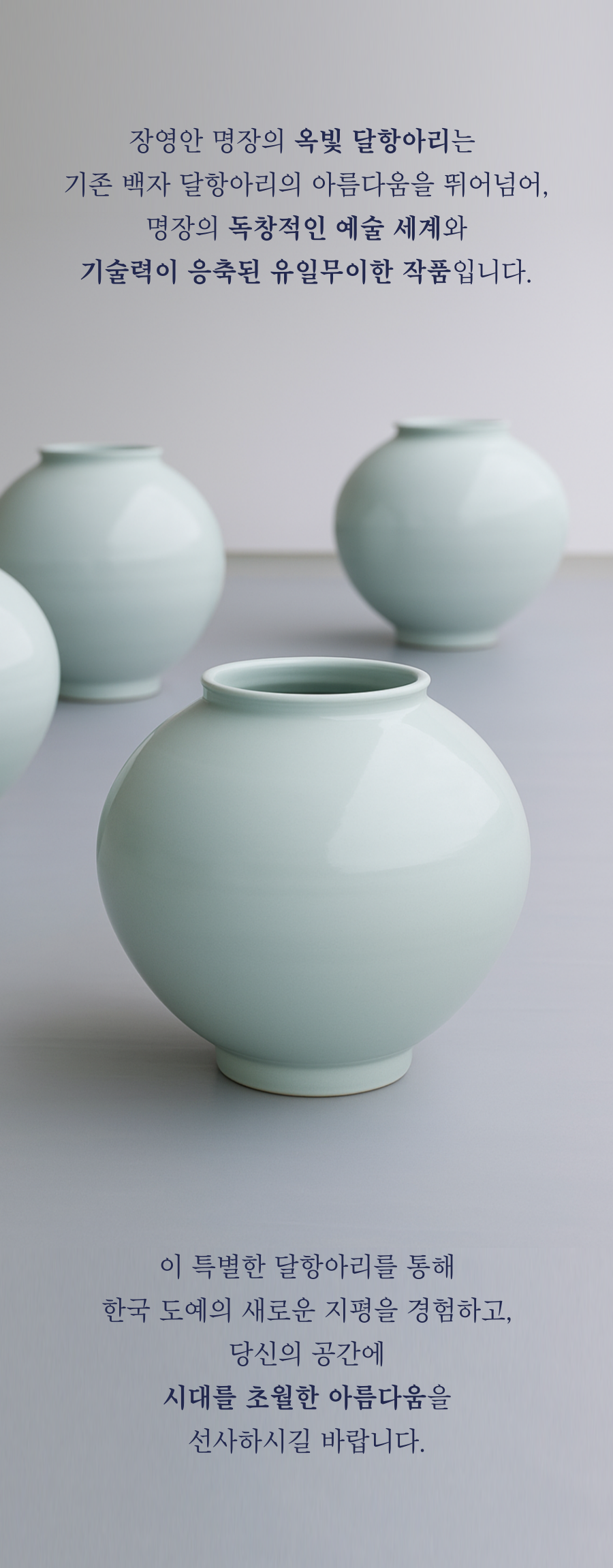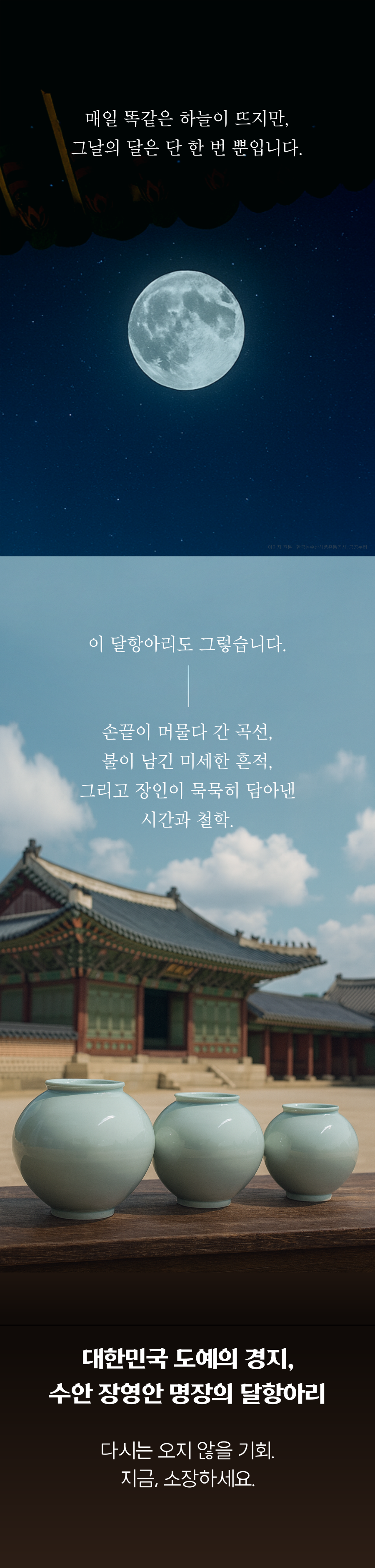 이 소중한 가치를 일부 컬렉터나 미술관에서만 접하는 것이 아니라, 더 많은 분들이 일상에서 소유하고 느낄 수 있도록 하고 싶었습니다. 이러한 마음을 담아 전통을 현대의 삶으로 가져오는 가장 좋은 방법을 선택하게 되었습니다. 명장님의 옥빛 달항아리는 바라보는 것만으로도 마음이 평온해지는 깊은 아름다움을 지니고 있습니다. 유행에 휩쓸리지 않는 이 고요한 아름다움이 여러분의 공간에 스며들어 일상의 품격을 높여줄 것입니다. 감사합니다.