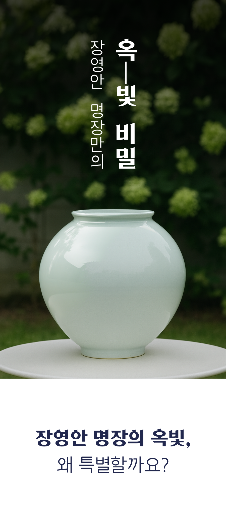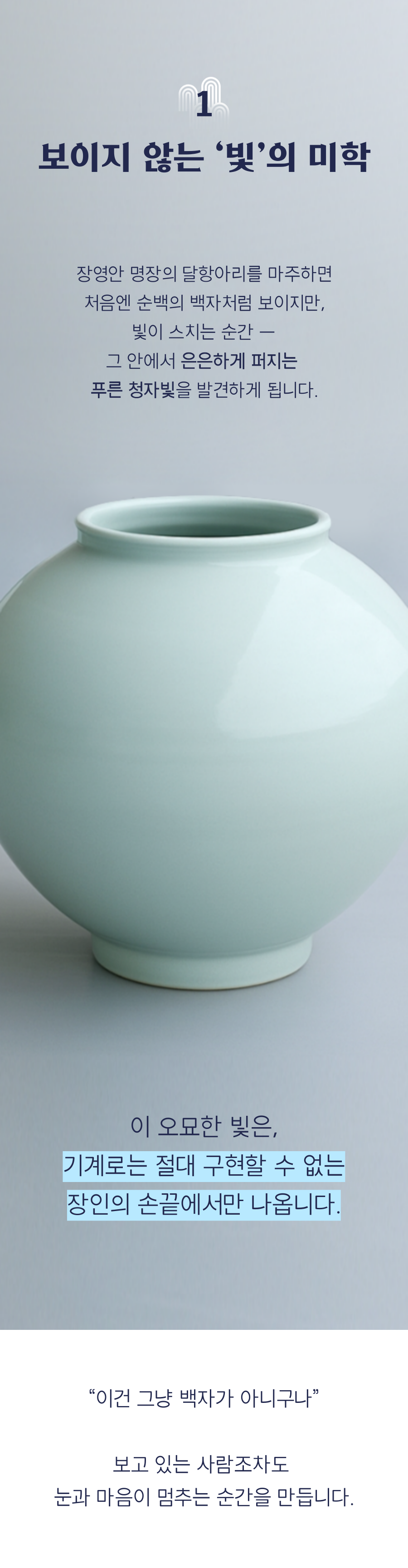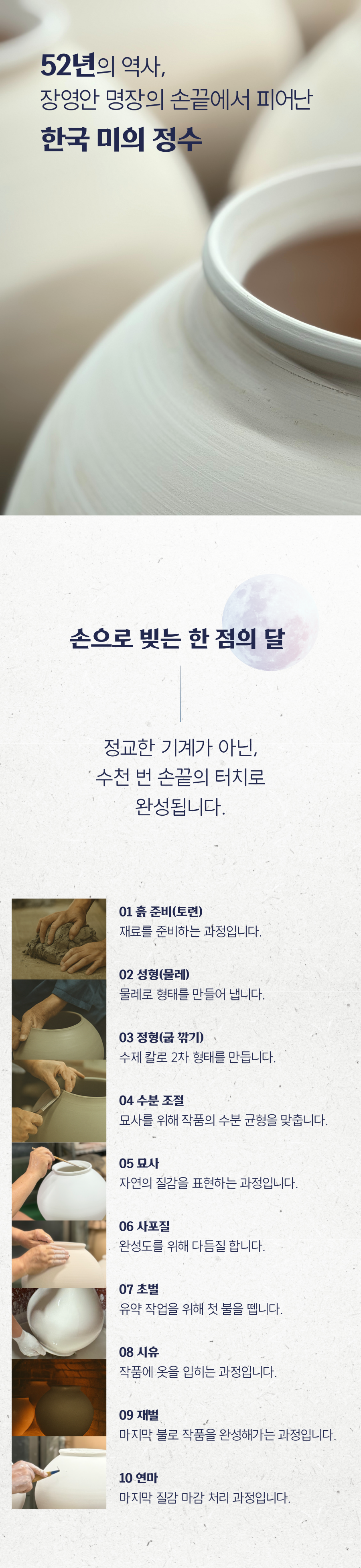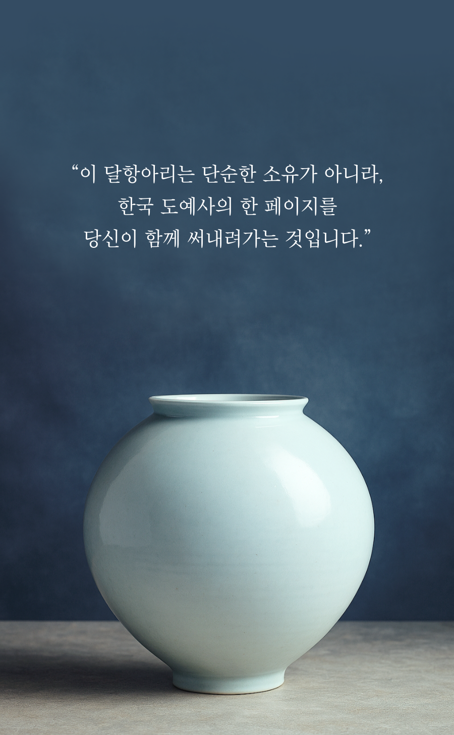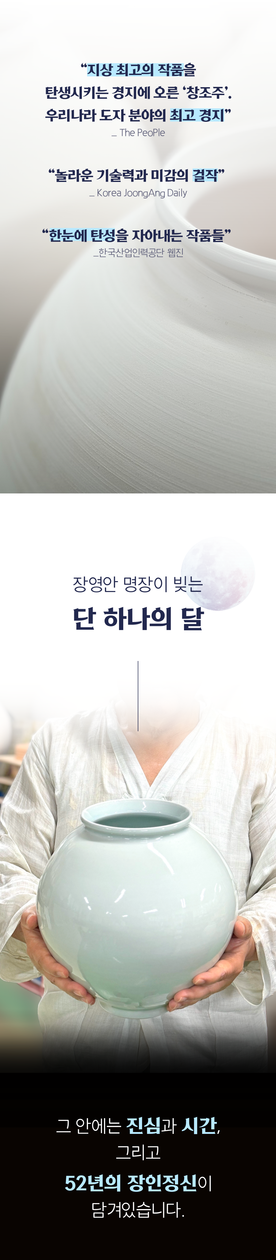 이 소중한 가치를 일부 컬렉터나 미술관에서만 접하는 것이 아니라, 더 많은 분들이 일상에서 소유하고 느낄 수 있도록 하고 싶었습니다. 이러한 마음을 담아 전통을 현대의 삶으로 가져오는 가장 좋은 방법을 선택하게 되었습니다. 명장님의 옥빛 달항아리는 바라보는 것만으로도 마음이 평온해지는 깊은 아름다움을 지니고 있습니다. 유행에 휩쓸리지 않는 이 고요한 아름다움이 여러분의 공간에 스며들어 일상의 품격을 높여줄 것입니다. 감사합니다.