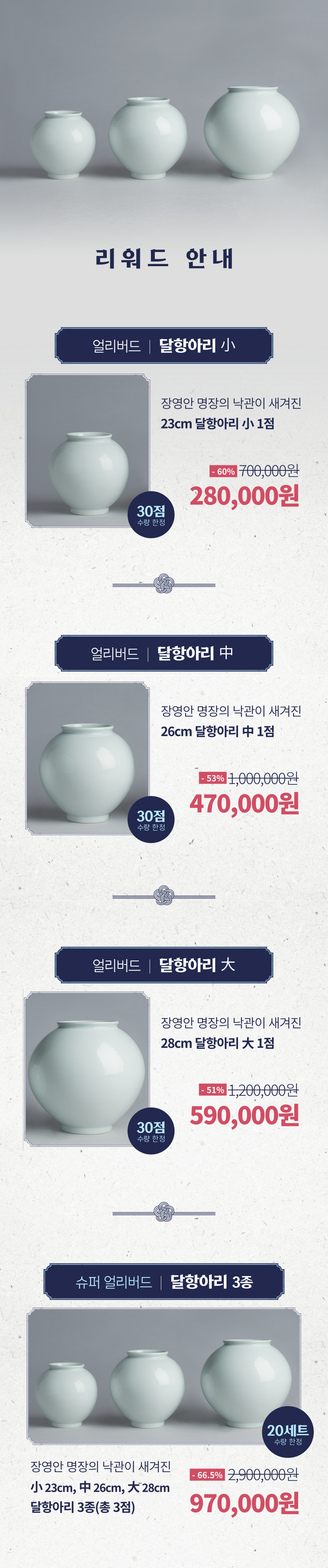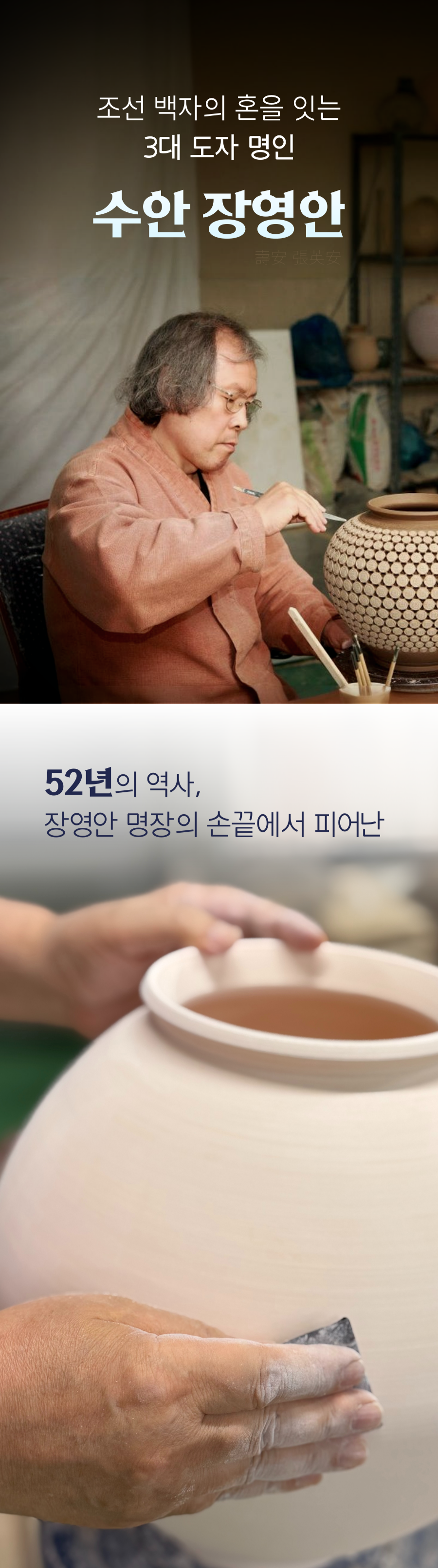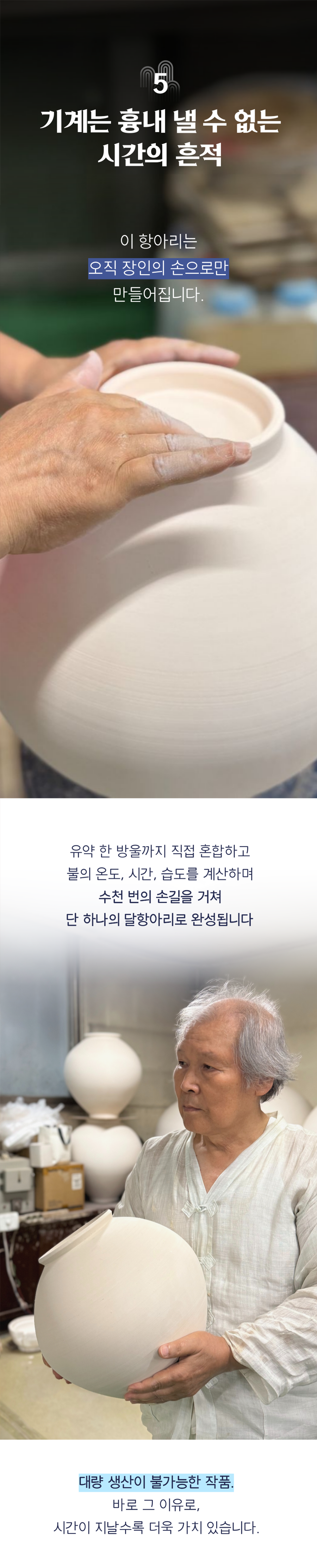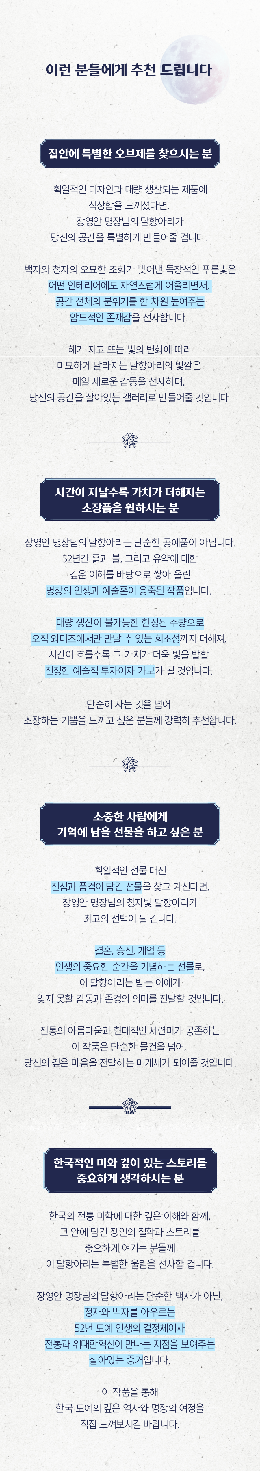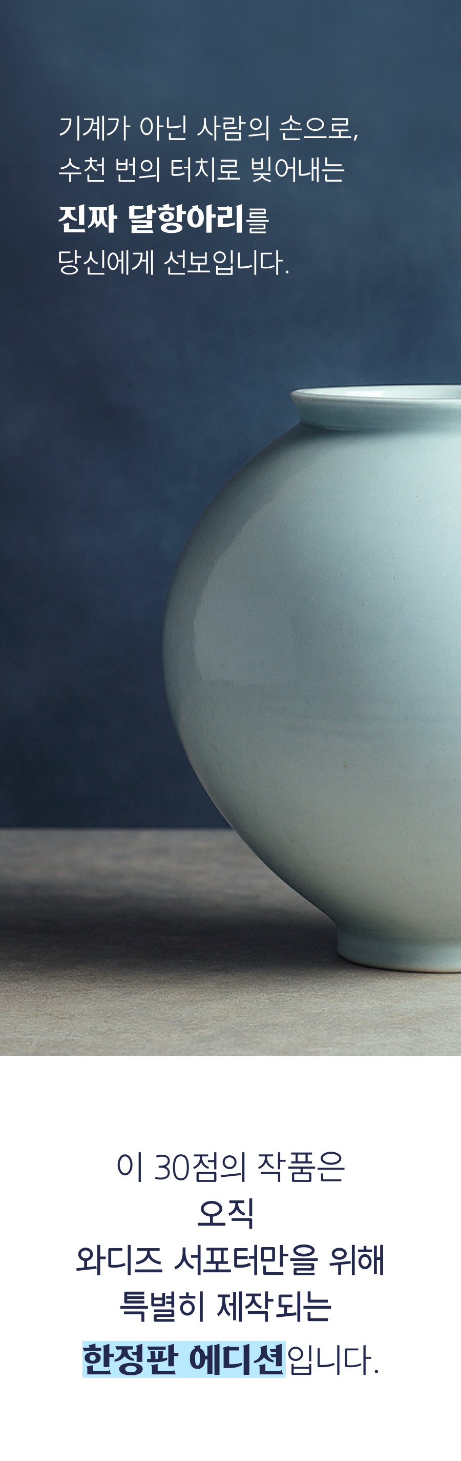 이 소중한 가치를 일부 컬렉터나 미술관에서만 접하는 것이 아니라, 더 많은 분들이 일상에서 소유하고 느낄 수 있도록 하고 싶었습니다. 이러한 마음을 담아 전통을 현대의 삶으로 가져오는 가장 좋은 방법을 선택하게 되었습니다. 명장님의 옥빛 달항아리는 바라보는 것만으로도 마음이 평온해지는 깊은 아름다움을 지니고 있습니다. 유행에 휩쓸리지 않는 이 고요한 아름다움이 여러분의 공간에 스며들어 일상의 품격을 높여줄 것입니다. 감사합니다.
