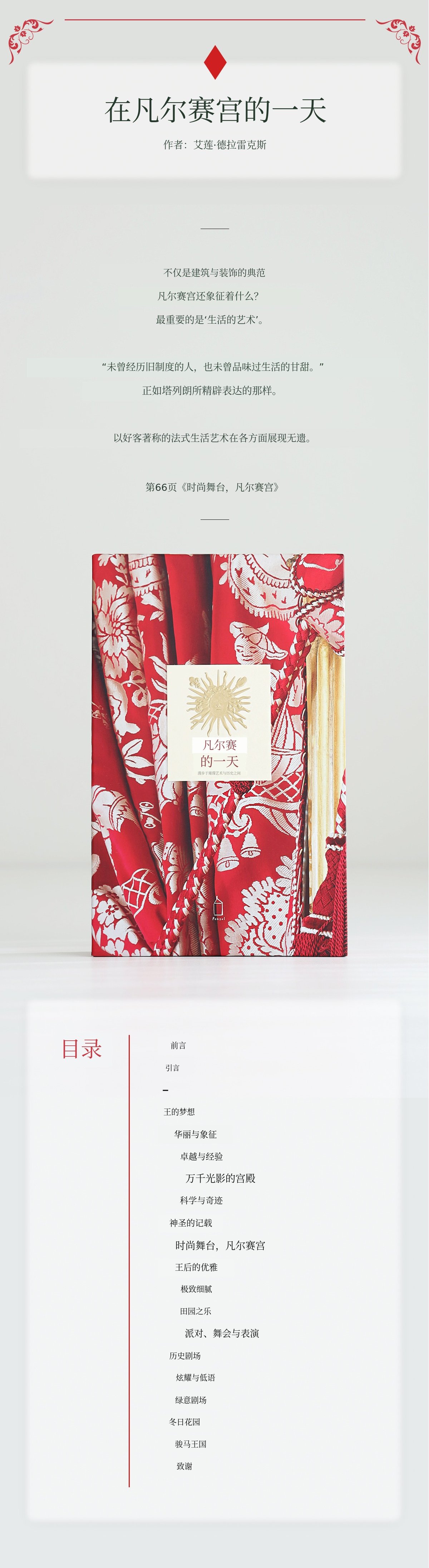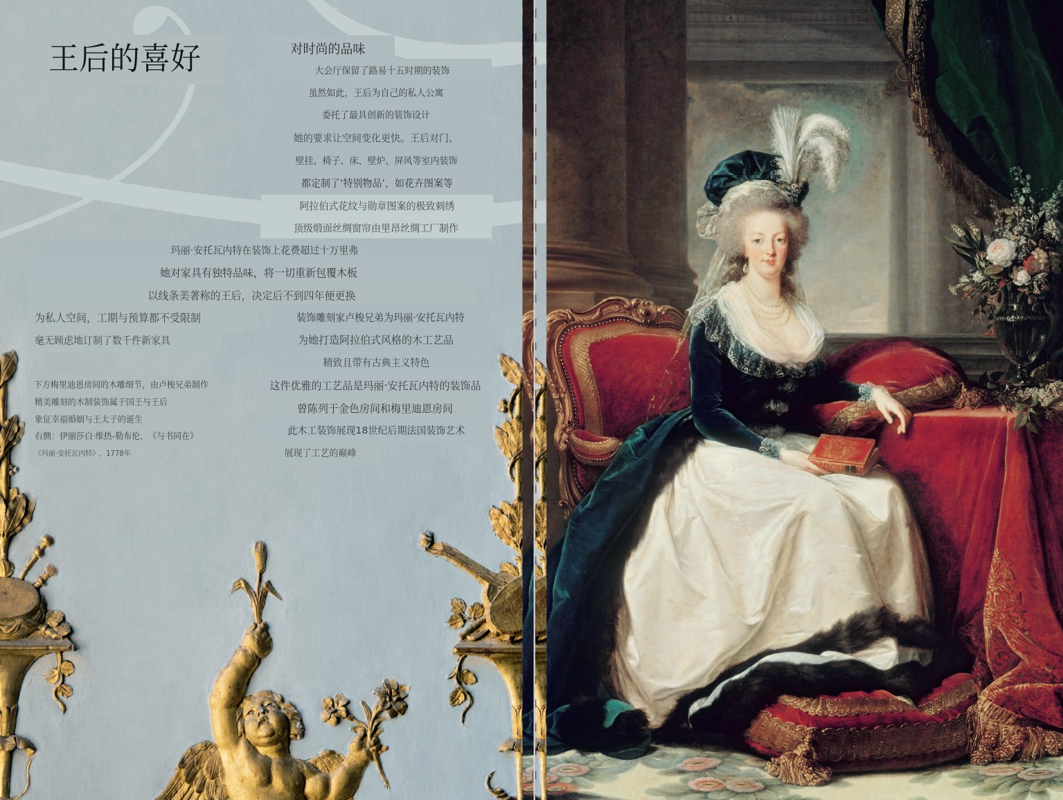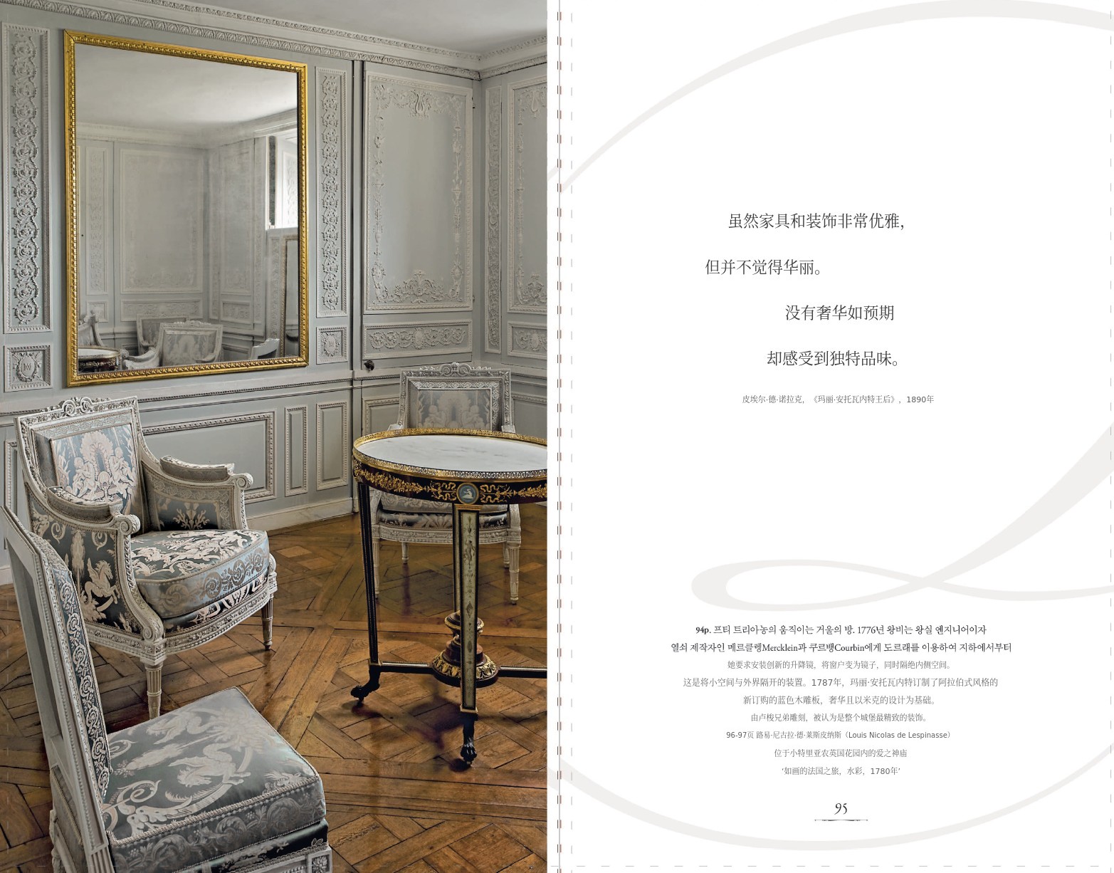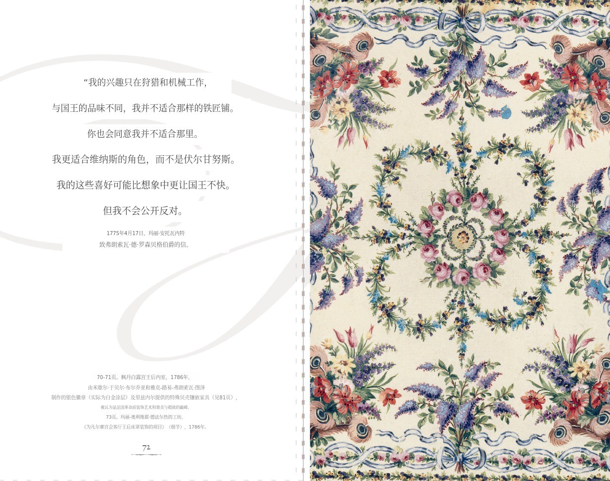这次为大家介绍的《与玛丽·安托瓦内特的一天》正是基于这样的视角策划的书。从凡尔赛的房间和花园、小剧场,到她亲手打理的特里亚农花园——这本书不仅仅是传递信息,更让读者仿佛亲自漫步于这些空间,带来生动的体验。
