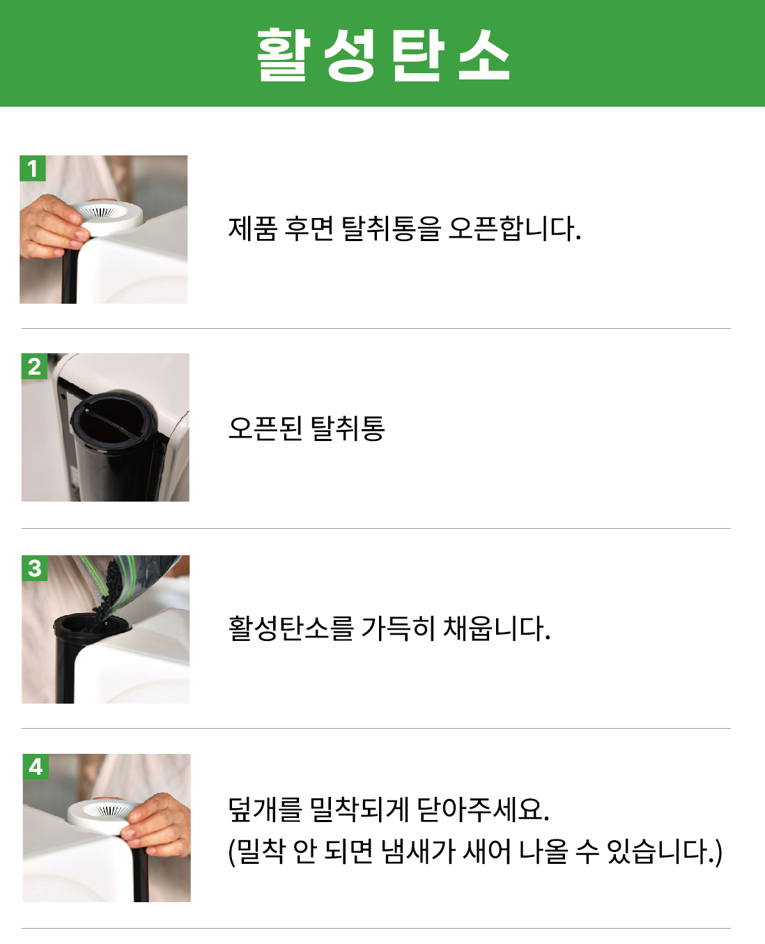활성탄을 가득 채우고 뚜껑을 꽉 조여주세요.