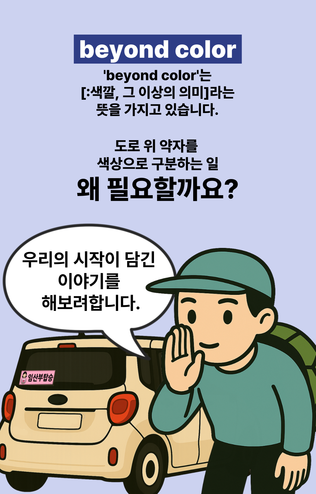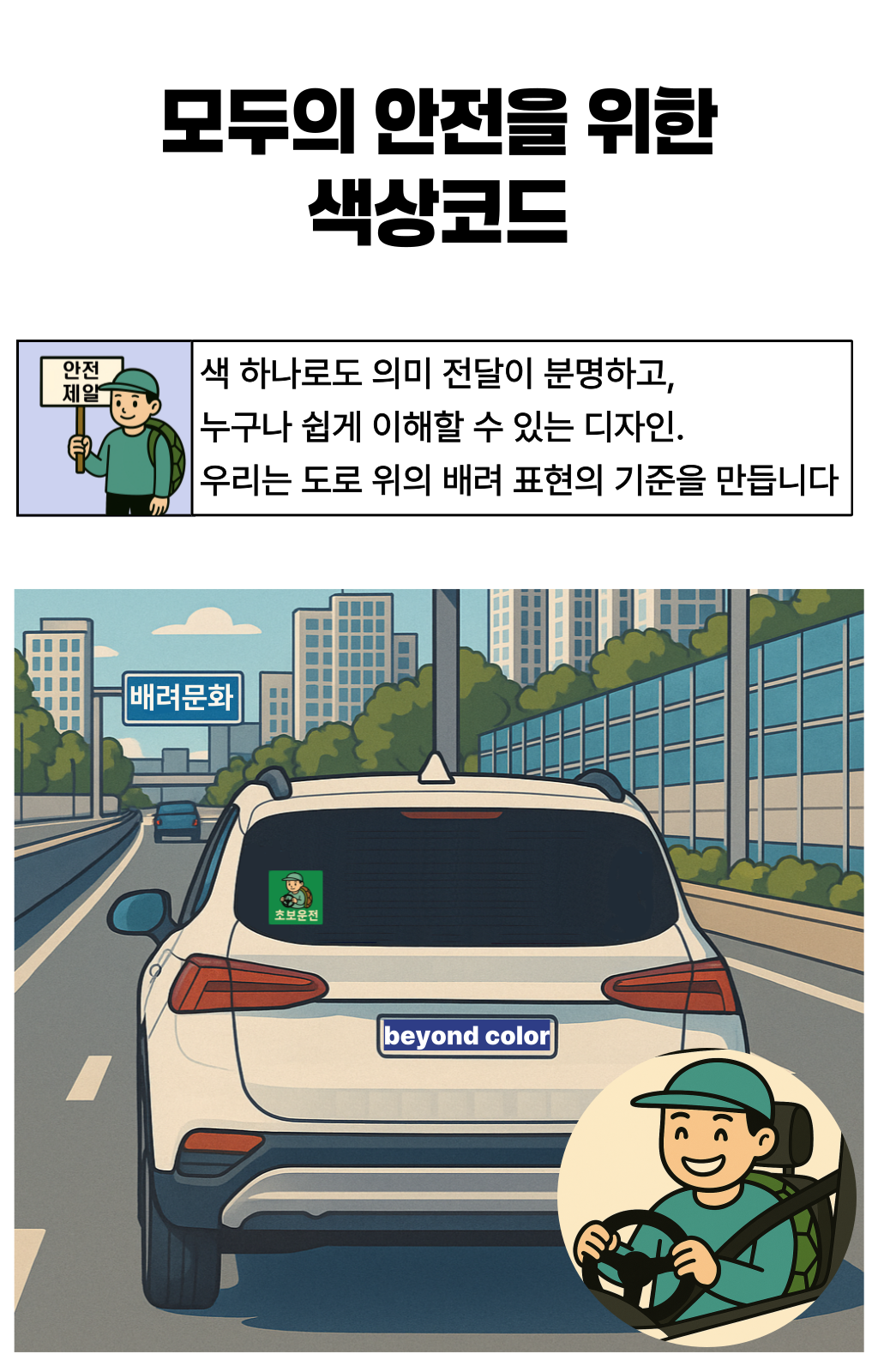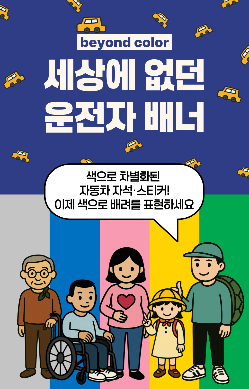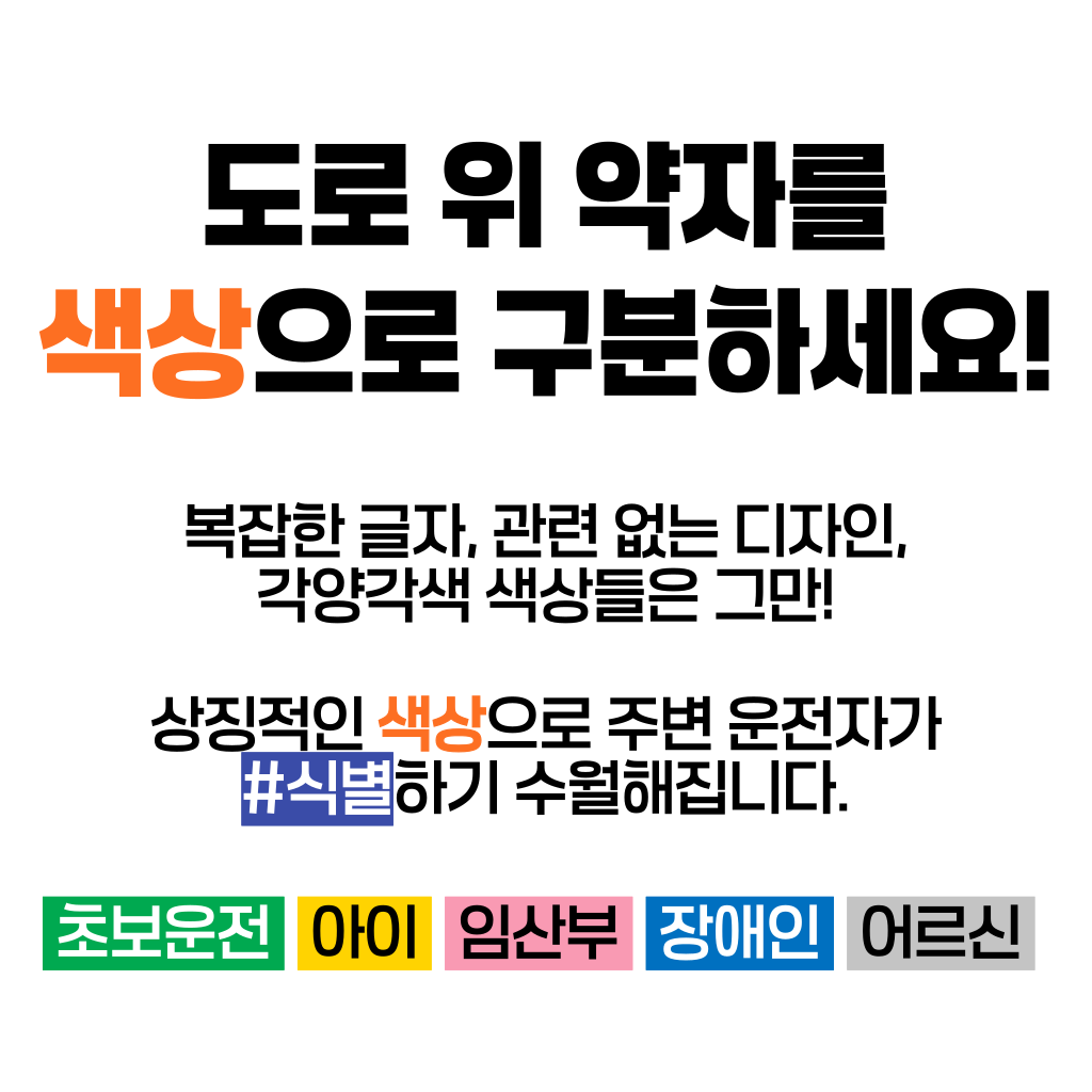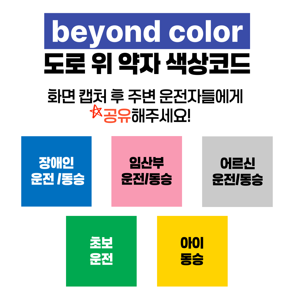 한 차량에게 양보했는데, 그 안에는 노부부가 타고 계셨습니다.노신사분은 창문 너머로 연신 고개를 숙이며 감사 인사를 전하셨죠. 문득 이런 생각이 들었습니다. ‘누구에게나 양보할 수 있지만, 도로 위 약자를 알아볼 수 있다면 더 쉽게 마음이 움직이는구나’라고요. 생각은 저 스스로에게 질문을 던지게 했습니다. ‘그렇다면, 어떻게 하면 더 잘 알아볼 수 있을까? ’복잡한 문구나 의미가 모호한 이미지보다, 한눈에 들어오는 색이라면 그날의 저처럼 생각한 운전자들이 더 빠르고 쉽게 인식하고 배려할 수 있을 것 같은 느낌이 들었습니다. 그렇게 도로 위의 약자를 빠르게 식별하고, 배려로 이어지는 문화를 만들자는 마음으로 비욘드컬러의 첫 프로젝트가 시작되었습니다.