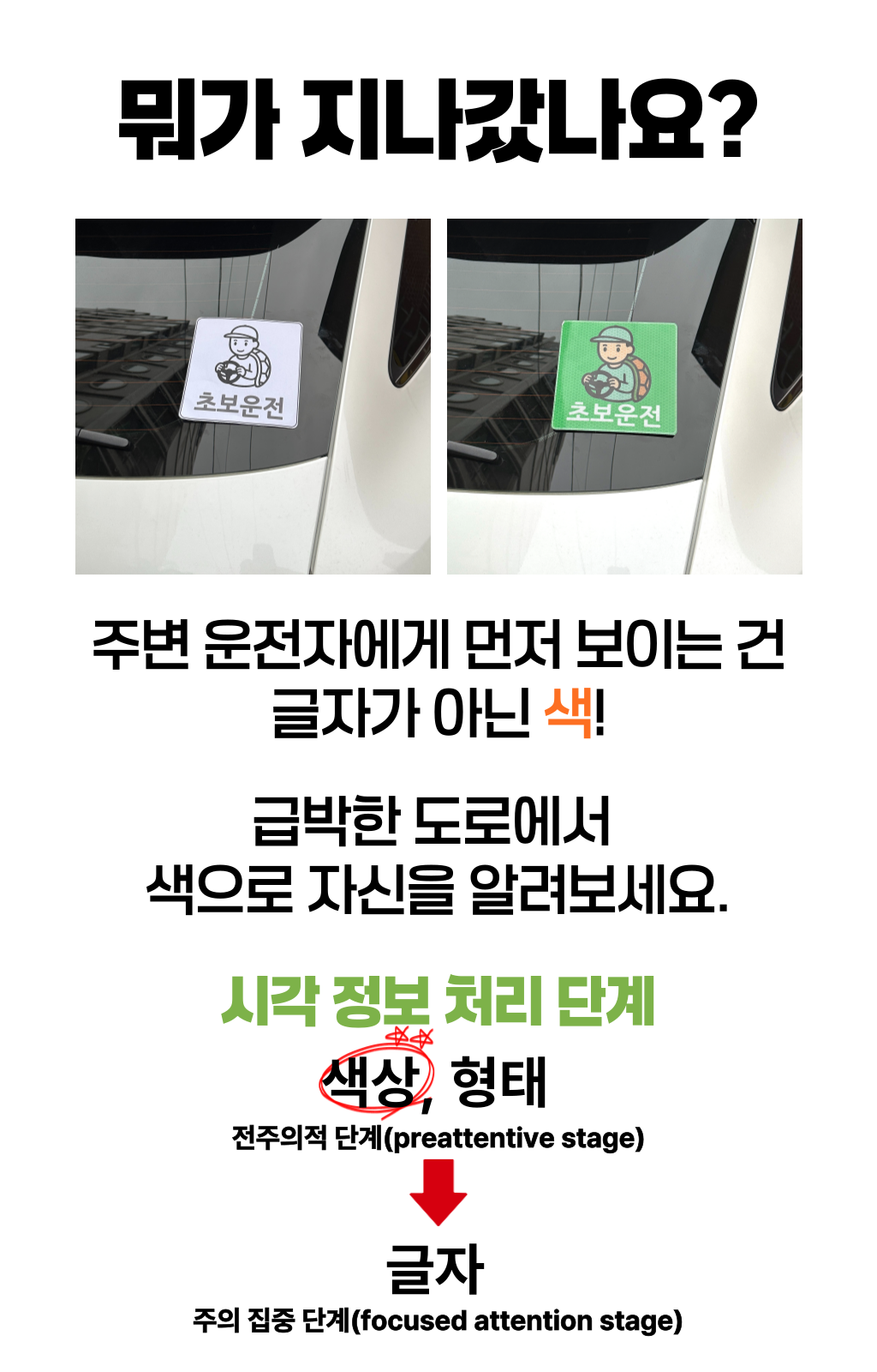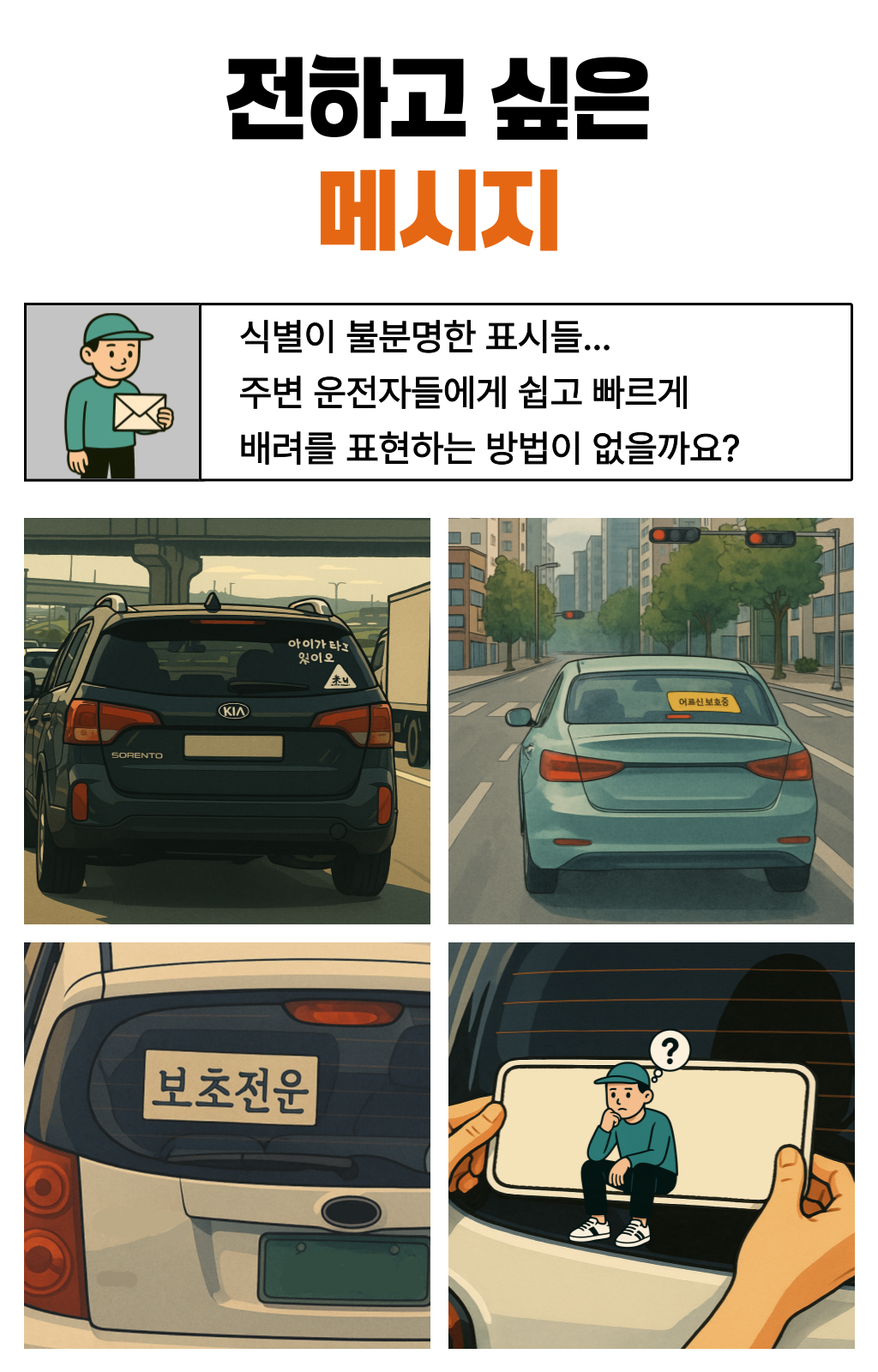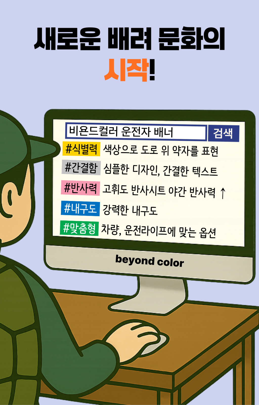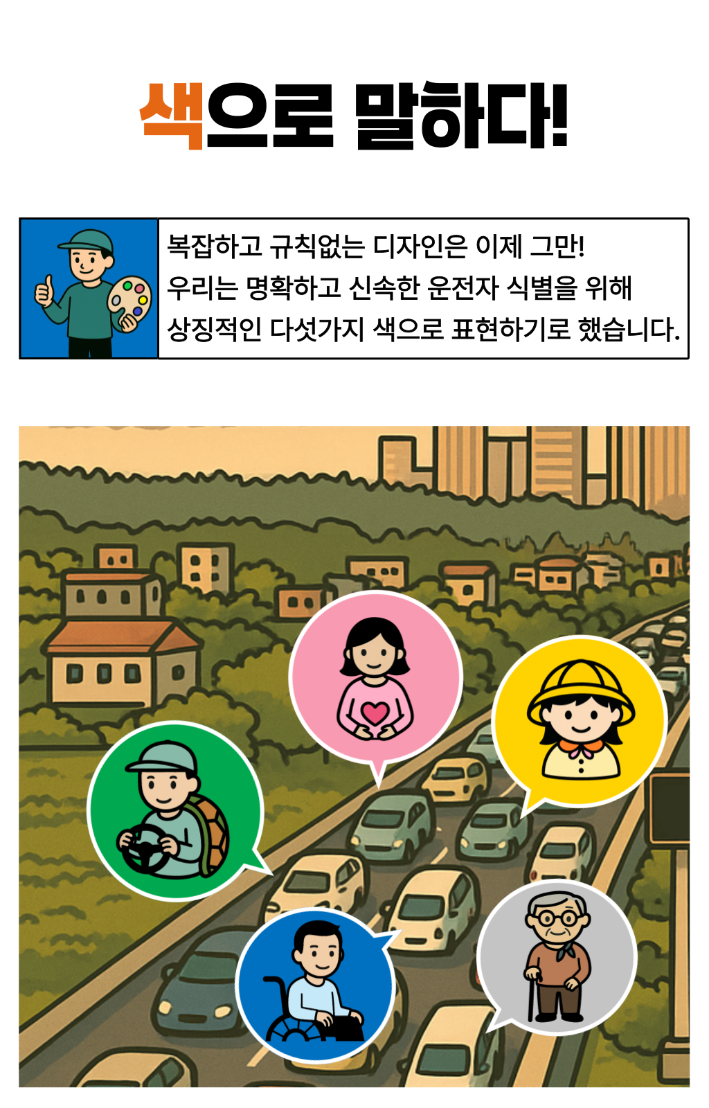 한 차량에게 양보했는데, 그 안에는 노부부가 타고 계셨습니다.노신사분은 창문 너머로 연신 고개를 숙이며 감사 인사를 전하셨죠. 문득 이런 생각이 들었습니다. ‘누구에게나 양보할 수 있지만, 도로 위 약자를 알아볼 수 있다면 더 쉽게 마음이 움직이는구나’라고요. 생각은 저 스스로에게 질문을 던지게 했습니다. ‘그렇다면, 어떻게 하면 더 잘 알아볼 수 있을까? ’복잡한 문구나 의미가 모호한 이미지보다, 한눈에 들어오는 색이라면 그날의 저처럼 생각한 운전자들이 더 빠르고 쉽게 인식하고 배려할 수 있을 것 같은 느낌이 들었습니다. 그렇게 도로 위의 약자를 빠르게 식별하고, 배려로 이어지는 문화를 만들자는 마음으로 비욘드컬러의 첫 프로젝트가 시작되었습니다.